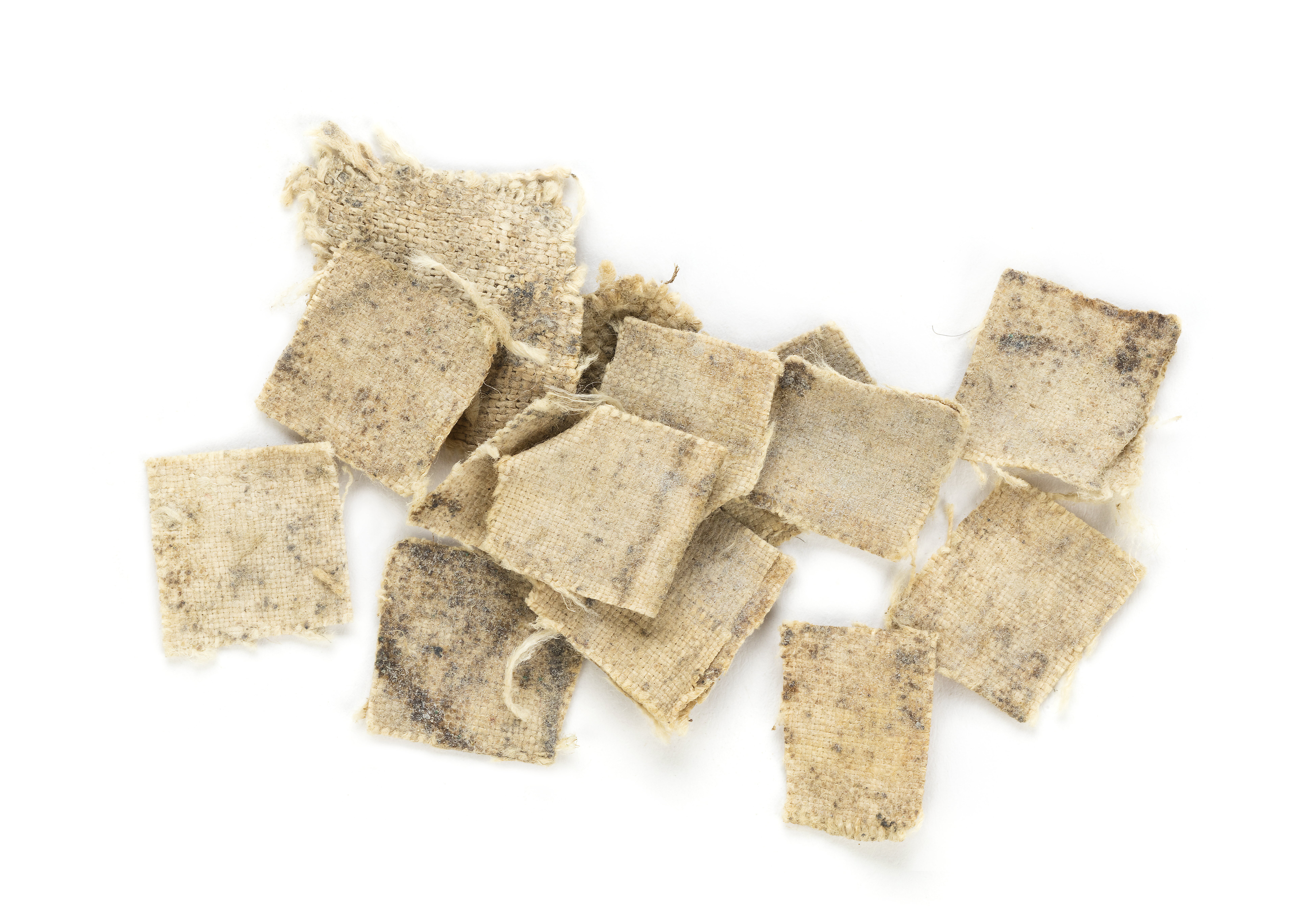 Förladdningar, 17 st oregelbundet fyrkantiga lappar av linne ? i tuskaft av olika grovlek, en b: ca 20 mm. Förvaras i kolvlådan på lodbössa nr 15.444.