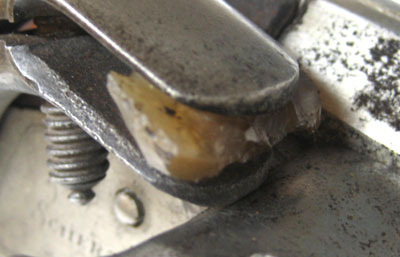 Gröngul flinta, rektangulär med grovt tillslagna sidor.