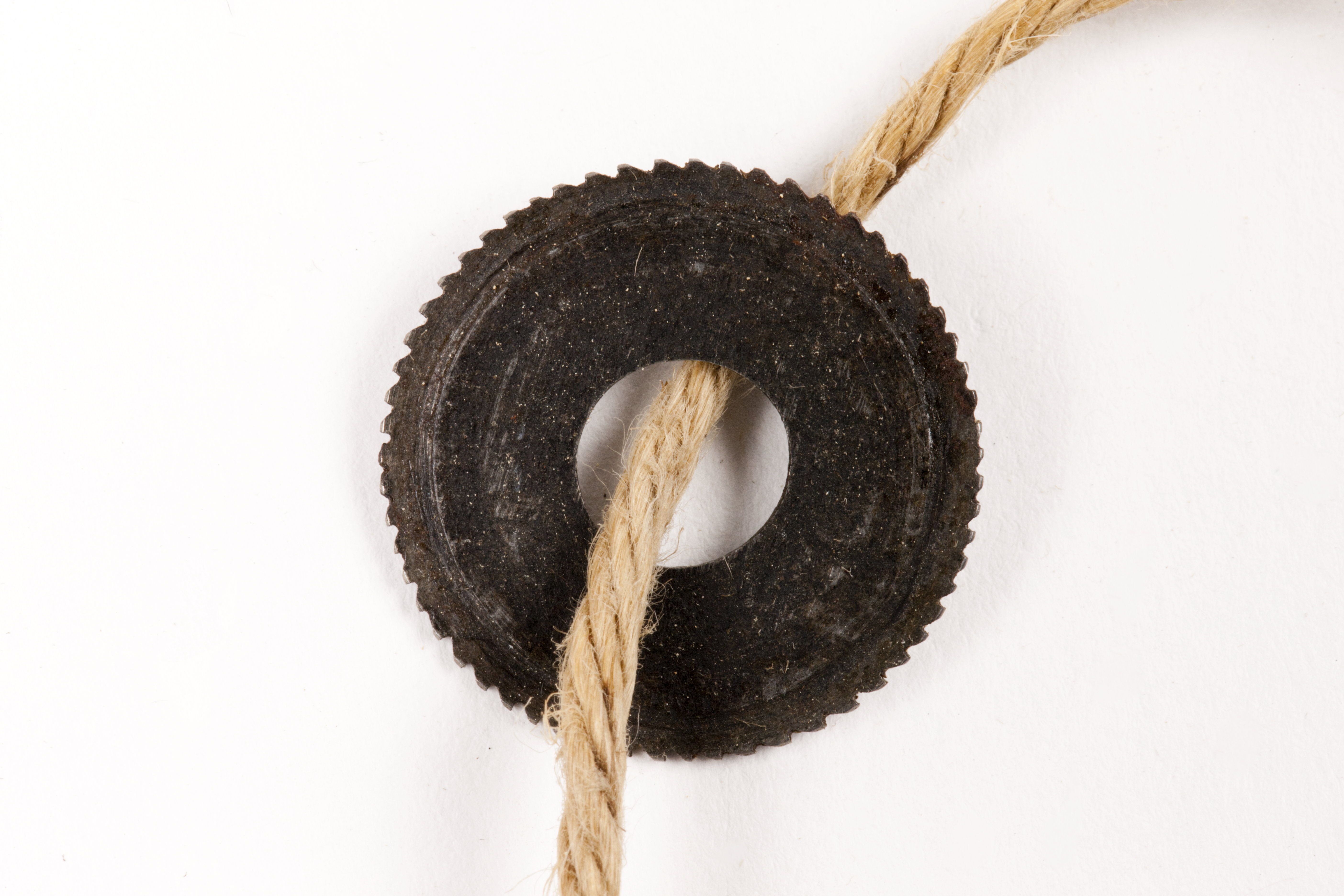 Rund, tjockare mot mitten. Tvärgående tänder. Hålets diam 7,5 mm. Stämplad med en punkt.