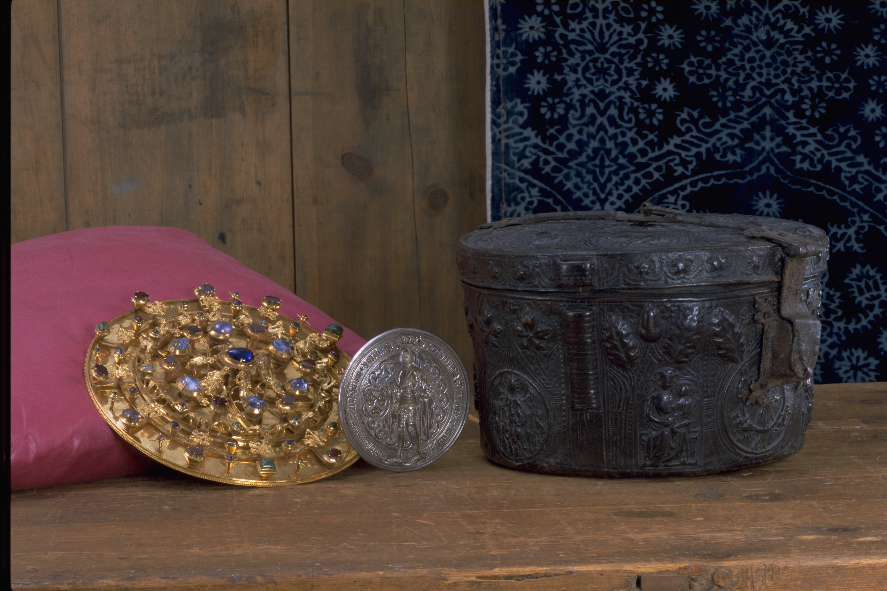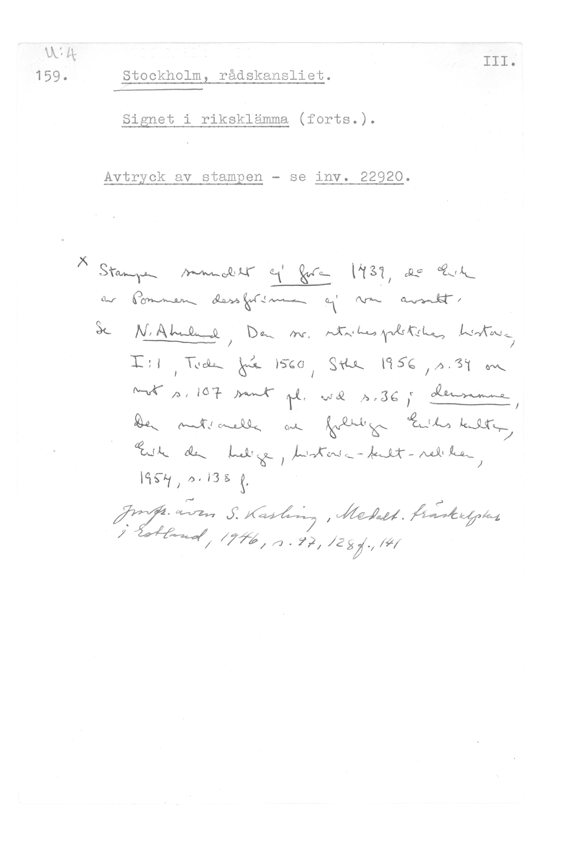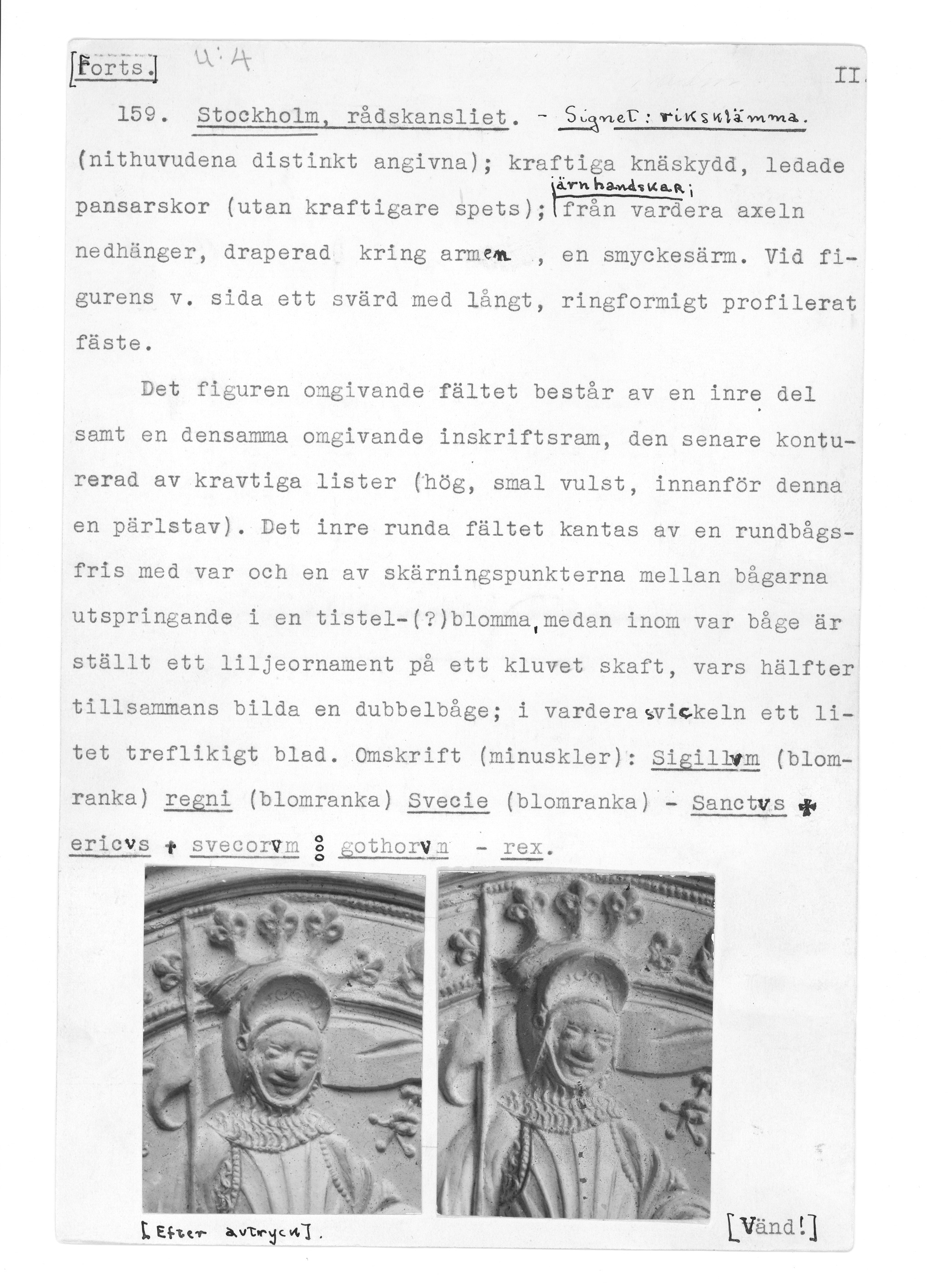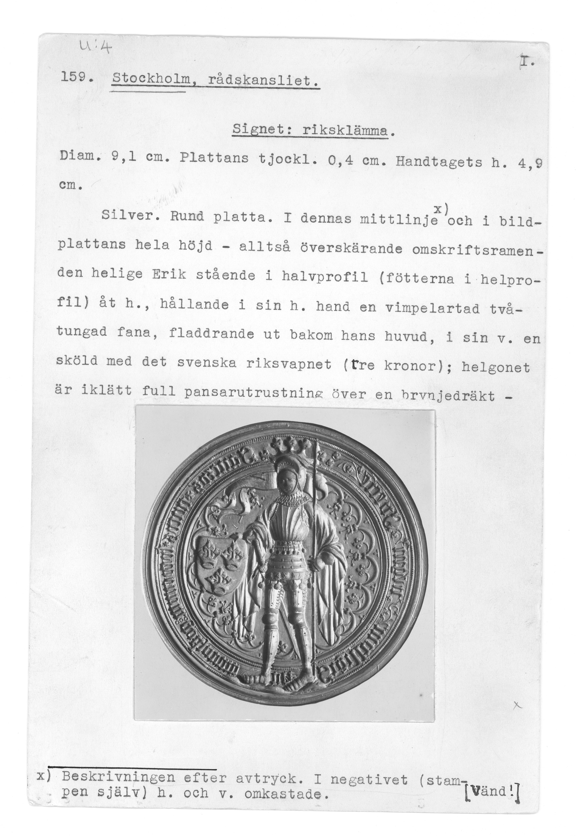 Visar S:t Erik i trekvartsprofil hållande en fana som fladdrar bakom hans huvud. I hans vänstra hand en sköld med det svenska riksvapnet, tre kronor. Klädd i rustning och hjälm. Omskriften lyder: "Sanctvs + ericvs + svevorum gothorum rex... Sigillum regni Svecie" (=Sankt Erik, svenvernas, götarnas konung. Sveriges rikes sigill)