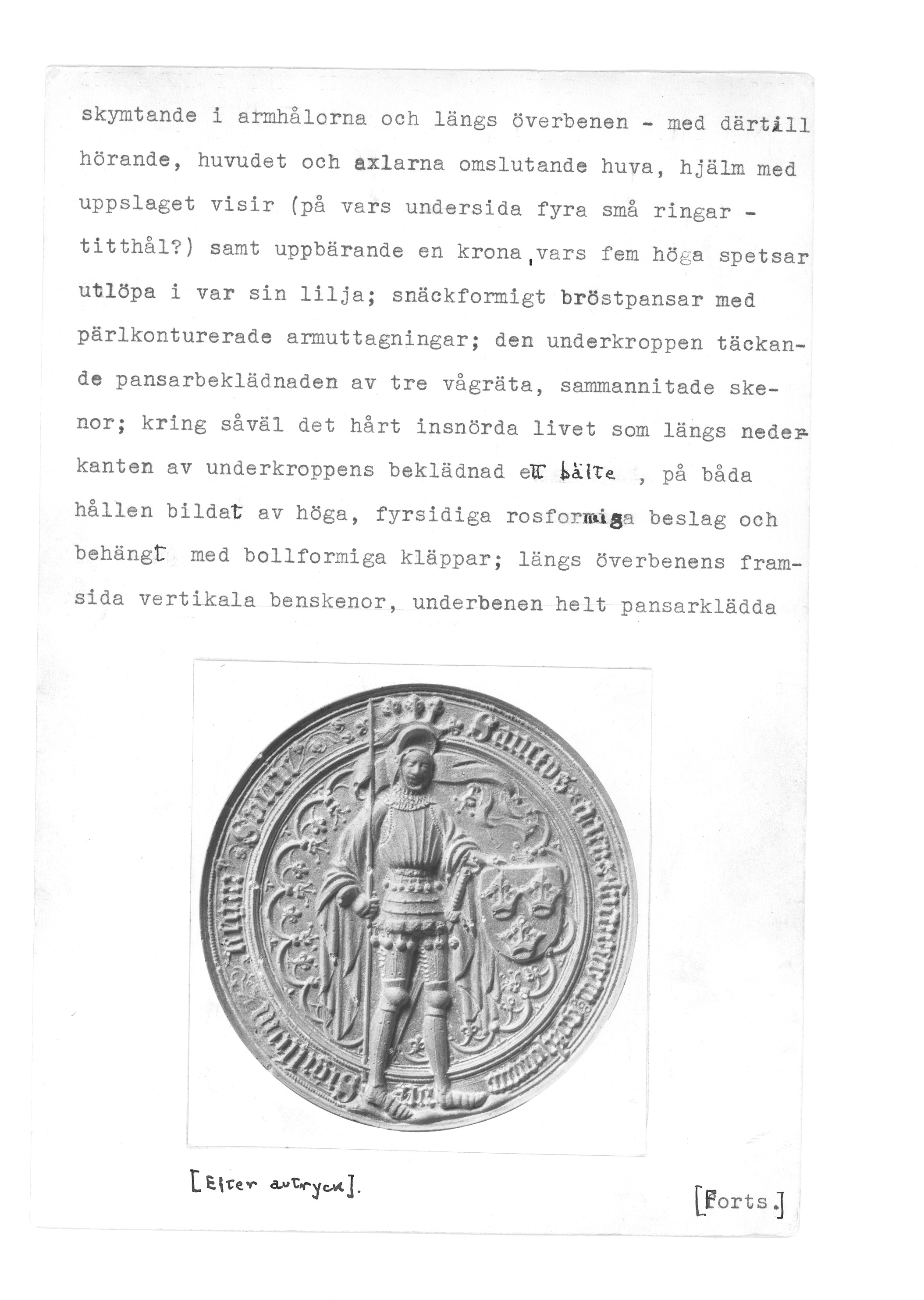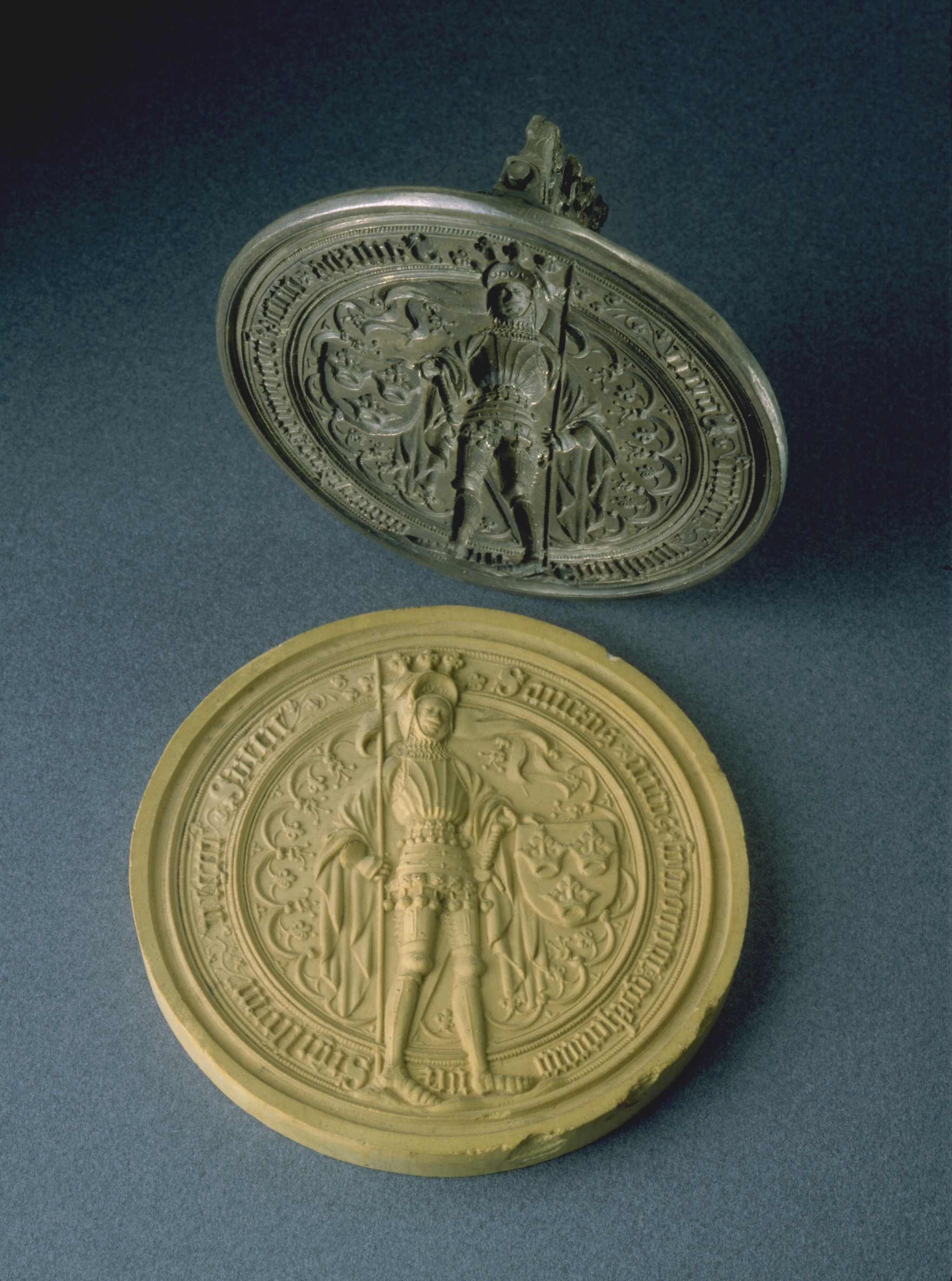 Inskrift: Sanctvs + ericvs + svevorum gothorum rex... Sigillum regni Svecie (Sankt Erik, svenvernas, götarnas konung. Sveriges rikes sigill)