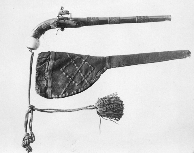 Fodral till snapplåspistol nr 6974, turkiskt kulturområde (Tjerkessien) 1841-1842, flinta nr 6295, handrem nr 6296.