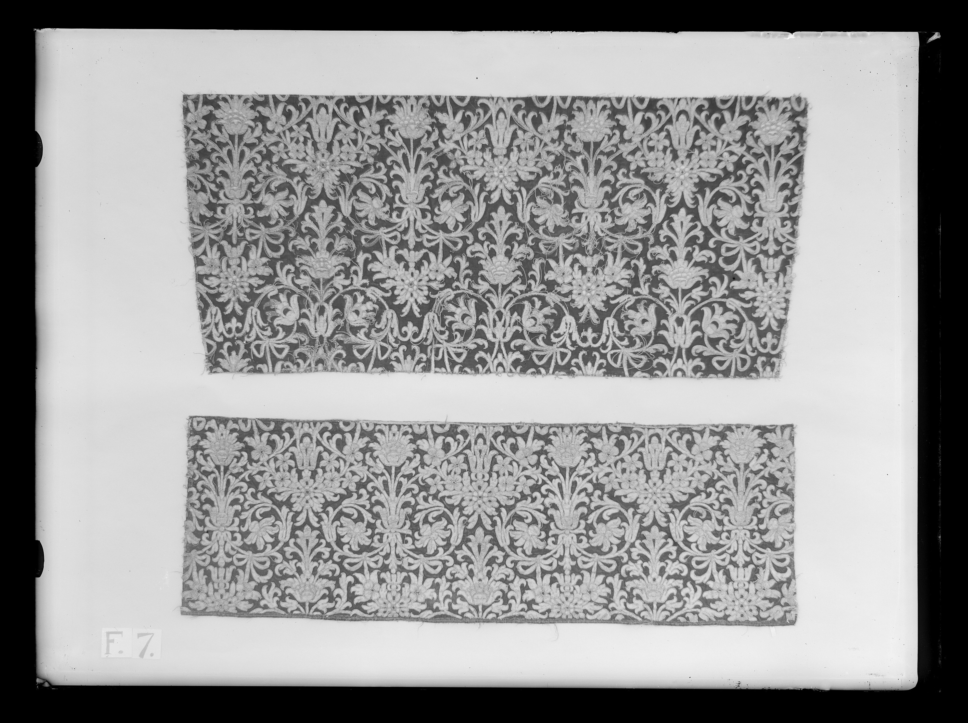 Bottentyg av röd sammet i kypert, med gulgrönrandig stadkant i långsidorna. Mönster av två omväxlande akantusmotiv, nedtill avslutade med ett blomstermotiv. Mönsterrapporten ej avslutad i sidorna. Broderiet yttäckande i läggsöm med trådar av guld och silver nersydda med silke. Konturer av snoddar med metall spunnet över en silkeskärna. Längs kantena har sytts på ett 10 mm brett rött bomullsband, halva synlig från rätsidan.