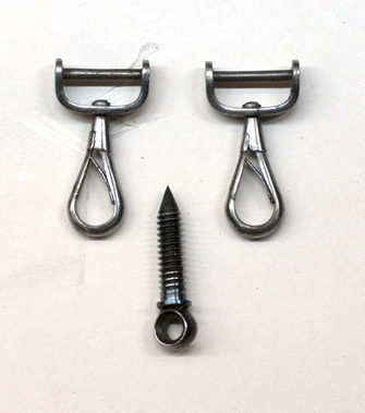 Två karbinhakar av stål, nertill försedda med en bred, i ett plan rörlig, u-formig bygel, h: 14,5 mm, med tvärgående, fast, rund stålstav.