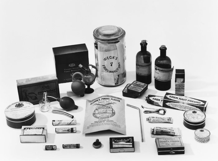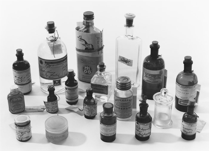 APOTEKSLÅDA Av furu med lock och handtag, invändigt plåtklädd. Lådan innehåller 43 föremål eller medikamenter. Mått: H 35 B 50 cm Innehåll: 2 askar kodeinkakor (hosta), 1 ask stolpiller (astma), 1 ask Pantopon (smärtstillande) med 9 ampuller, 1 ask Cardiazolampuller (hjärtat) med 6 ampuller, 1 ask Digitotal-ampuller (hjärtat) med 5 ampuller, 1 förpackning Solubaine (franska hjärtdroppar) med pipett, 1 fl. Roséns bröstdroppar (hosta), 2 flaskor ögondroppar, 1 ask Cibalgin (smärtstillande), 1 tub Phanodorm (sömnmedel), 1 tub Veramon (sömnmedel), 1 burk stolpiller med morfin och Belladonna, 1 flaska Pepsin (magmedel), 1 flaska magmedicin enl. recept, 1flaska Isacen (magmedel enl recept), 1 tub Adalin (sömnmedel), 1 flaska Pyralgin (förkylning), 1 flaska Adrenalinlösning, 1 flaska nässpray, 1 flaska koksaltlösning, 1 flaska Sublimatlösning, (mycket giftig, för tvätt/sterilisering), 1 flaska Emsersalt (slemlösande), 1 burk Herbal Skin Food (hudkräm), 1 flaska Borsyrelösning, 1 flaska Burrows lösning (våtvärmande omslag), 1 tub Hydrozon-salva (snuva), 1 tub Radiumsalva (reumatism), 1 flaska Glycerin, 1 flaska Oxygenollösning (munvatten), 1 tom (sprit)flaska, 1 glasburk med lock (innehållande aromatisk olja-vaselin), 1förpackning Allocks porous-plaster (smärtplåster), 1 sugrör av glas (för mineralvatten), 2 askar Wucherers bröst bonbons, 1 inhalationsapparat Oel-Zerstäuber m ask, 1 inhalationsapparat KIFA m ask, 1 tub Krem-Hautfreund (hudkräm), 1 glasburk m lock innehållande 40 st avdelade pulver (magmedicin) i påse, 1 tub Cardiazoltabletter (hjärtat), 1 kapsylöppnare. Medicinerna har använts av Wilhelmina von Hallwyl, f. Kempe under hennes sjukdomstid 1929-1930. Lådans innehåll identifierades 1994 av apotekare Roland Ericsson och Stig Ekström från Apotekarsocieteten och Farmacihistoriska sällskapet.