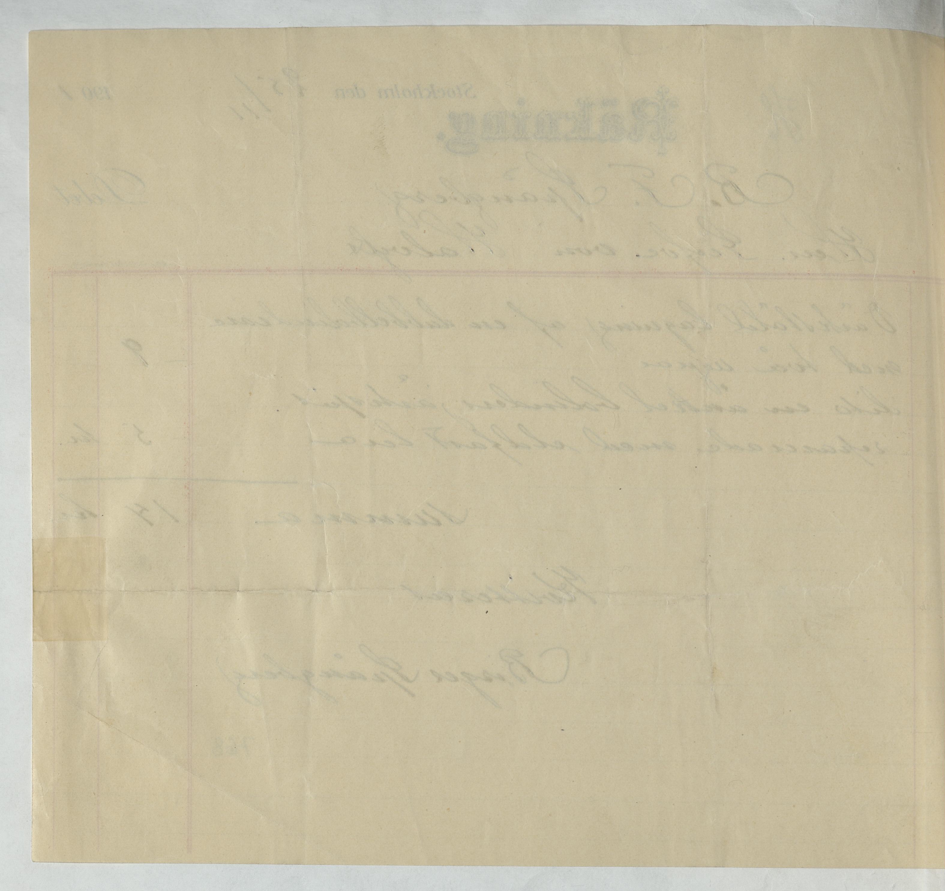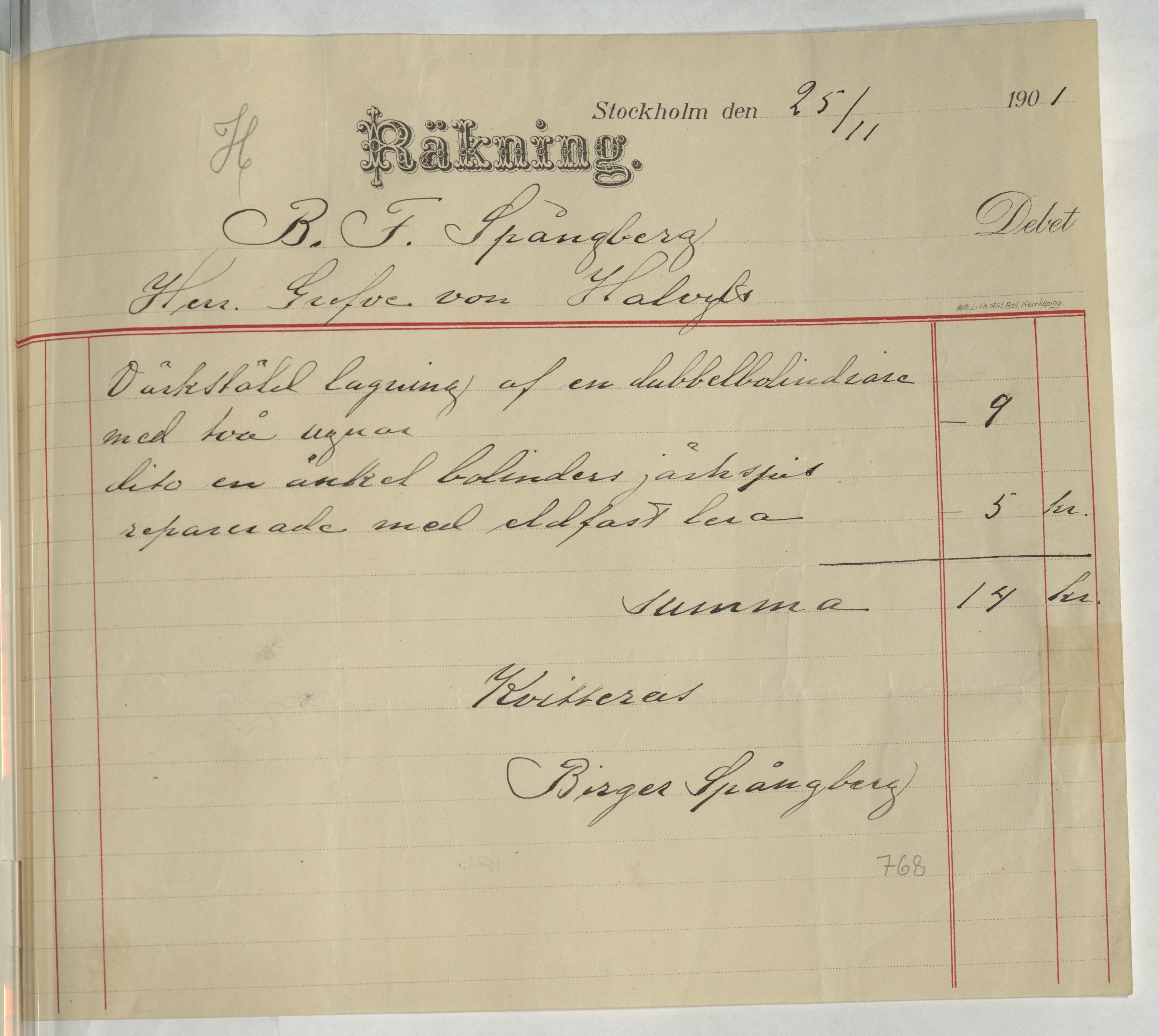 Kvitto från Birger Spångberg. Gällande lagning av järnspisar från Bolinder. Stockholm, 1901.