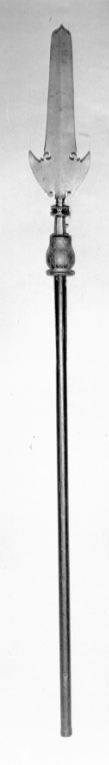 Blad med punsad, till största delen nedslipad ornering. Holk med rankor på alla sidor. Årtalet delvis synligt. Riksvapen Sverige med Vasahjärtsköld, slutna kronor i trekronorsfälten, sköldhållare krönta lejon. Namnchiffer C R S av raka, odekorerade bokstäver, krönta av slutna kronor. Hals, l: 32 mm, holk, l: 88, skenor, l: 355 mm. Skaft av brunmålad furu med stålskoning nedtill, b: 17 mm, stödstift för kvasten.