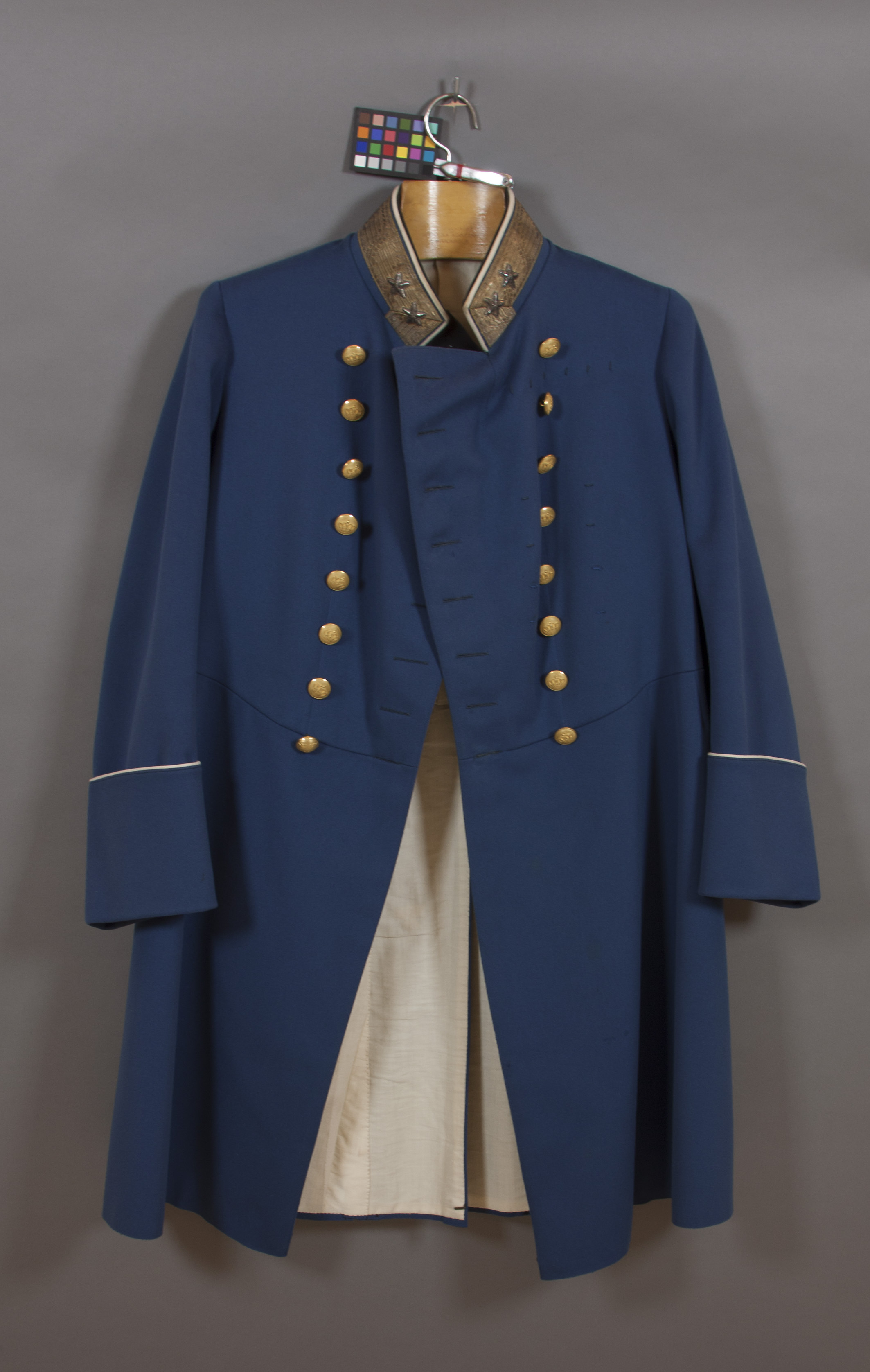 Syrtut av ljusblått kläde. Tvåradig, åtta knappar i varje rad, diameter 22 mm, av förgylld mässing. Firmamärke på insidan: "M. PETTERSON, STOCKHOLM". På vänster framstycke 14 tränsar för bröstdekorationer. Ståndkrage med 40 mm bred guldgalon samt två stjärnor av silverlan. Ärmuppslag 140 mm breda. Foder av vit bomull med innerficka med firmamärke: "J.M. JANSON & WALLGREN // KGL. OCH KEJSERL. HOVLEVERANTÖR. 7.9 STOCKHOLM 1909 // Hofstallmästare E. Rosenblad".