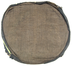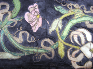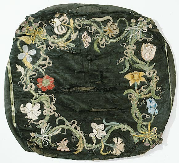Kvadratiskt stolsöverdrag av svart sidenatlas med rundade hörn och med kappor nedhängande från sidorna. Överdraget kantas runtom av ett broderi föreställande en girland av många olika sorters blommor i siden och silketråd och med detaljer av förgylld metalltråd. Broderiet går i rött, vitt, lila, grönt, gult, ljusblått och skärt. På undersidan är fodrat med svart linnelärft.