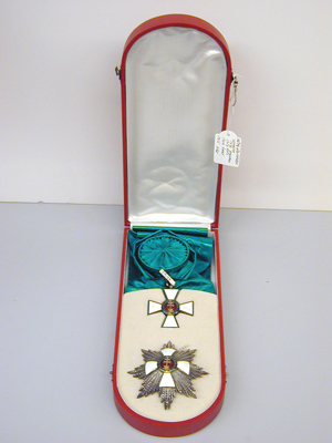 Åttauddig, flinkerad strålstjärna av silver, kraftigt välvd med uppåtböjda spetsar. Stjärnan belagd med vitemaljerat georgskors av guld(?) med smala gröna kanter. Rödemaljerad medaljong, därpå fäst patriarkkors, stående på treberg, krona runt korsfoten, allt av guld(?). Runtom en grönemaljerad lagerkrans av guld. Baksidan odekorerad, vertikalt placerad säkerhetsnål.