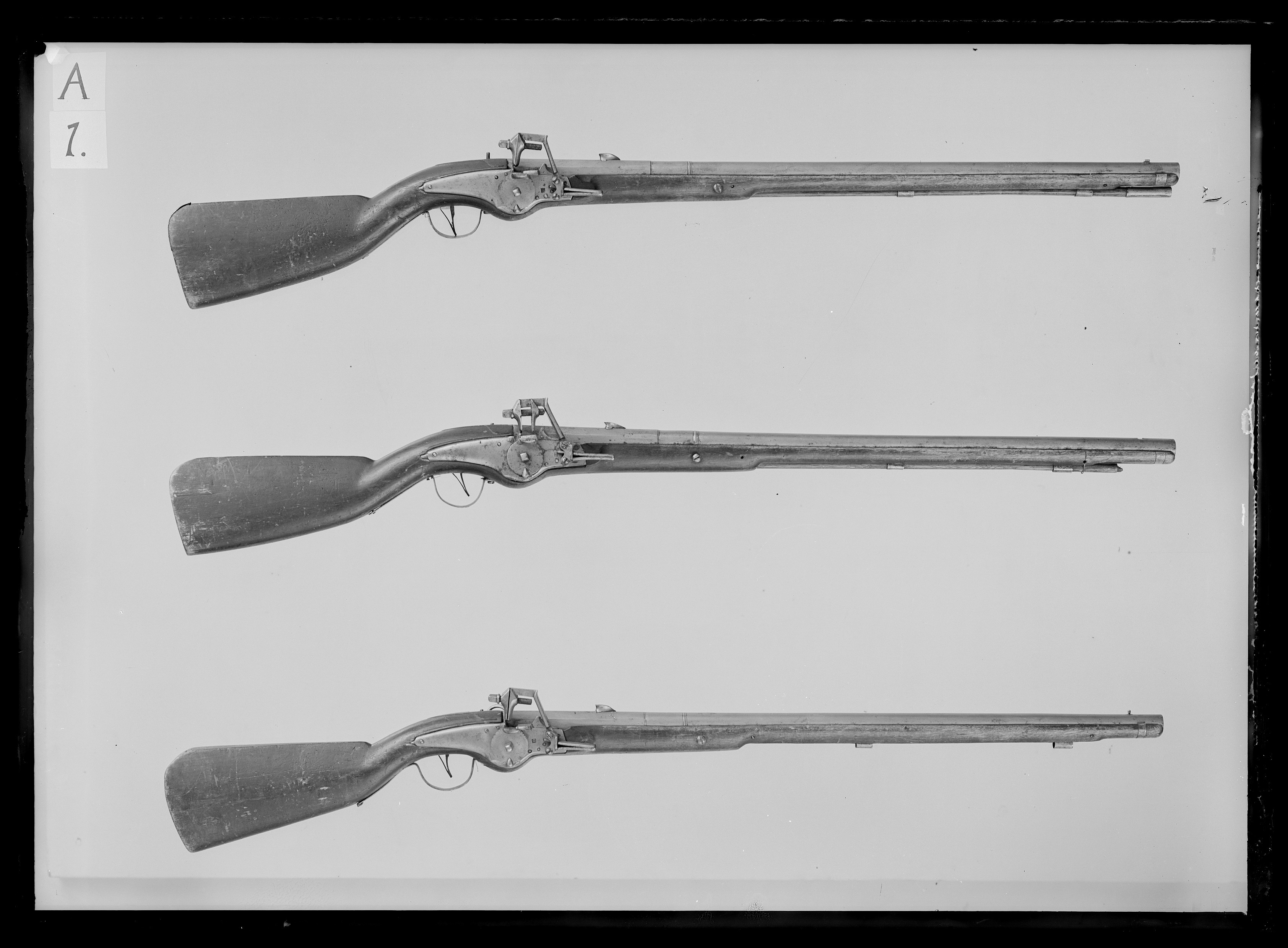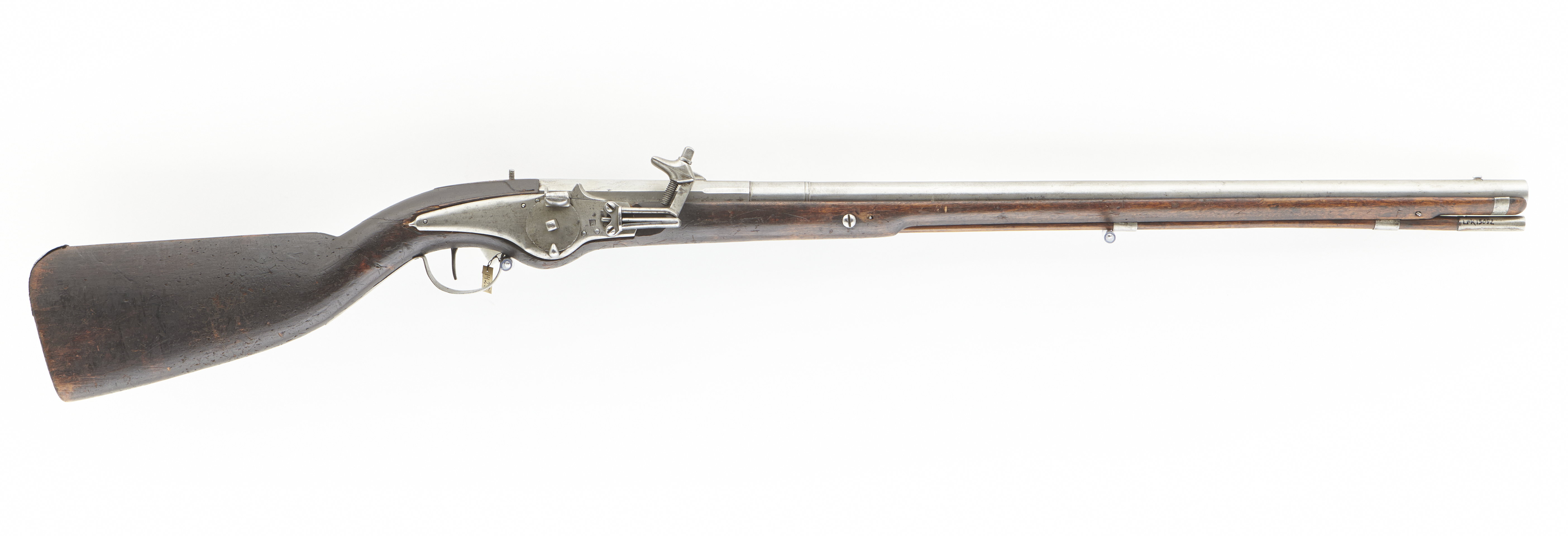 Rund, slätborrad pipa av stål, åttsidig kammare med fasade kanter framtill, därframför parti med något större diameter än pipan i övrigt, omgivet av en ring baktill och en profilerad ring framtill (ej parallella). Rakt, baktill tvärt avskuret svansskruvblad. På kammarens ovansida graverat: N.16 samt en kronstämpel. På undersidan en djupt inslagen, smal, rektangulär stämpel R?. Riktmedel: Inlaxat, hjärtformigt ståndsikte, 102 mm från pipbasen. Stolpkorn av stål, inlaxat 32 mm från mynningen. Fästning: Två häften. Pipan fäst med krysskruv underifrån (främre varbygelskruven), samt två pipstift av stål. Hjullås av västeuropeisk typ med välvt låsbleck, spetsig, försänkt bakspets, framför hjulet en stämpel E E. Utanpåliggande hjul, urspr. fäst med studel kl. 6. Fängpanna med låg gavel och undersida med rundad kanter. Fängpannelock med rörlig arm, utan tryckknapp (enbart stoppfjäder). Hane med rak kropp, rundad ytterkant. Rak, fyrsidig hals, huvud med lös underkäke, välvda över- resp. undersidor, kubiskt skruvhuvud med rundad ovansida. Hanfjäder (bräckt) med rundade kanter, omvänt B-formig hanstudel med kantlist mot fjädern. Fästning och avtryckare: Tre låsskruvar. Avtryckare omvikt till fjäder. Helstock av brunbetsad björk?. Kolv med rak, smal, plan rygg och rundad undersida, kindstöd med skuren bladvolut framtill och plan yta på nederkanten. Plan kolvände med svängd övergång till kolvryggen. Beslag av stål, på kolvänden en liten bakplåt över hälen fäst med sju stålstift. Smala, bandformiga rörkor och slätt näsband, b: 11 mm. Sidbleck - karbinstång med karbinring, d: 32 mm (går ej över sidblecket), sidbleck för de två bakre låsskruvarna, platta med nederkanten filad i två markerade, rundade flikar. Karbinstången, l: 235 mm, framtill fäst med skruv genom framstocken, liten platta. Bandformig varbygel med baktill rundad bakre arm, fäst med två spikar, framtill fäst med krysskruven.