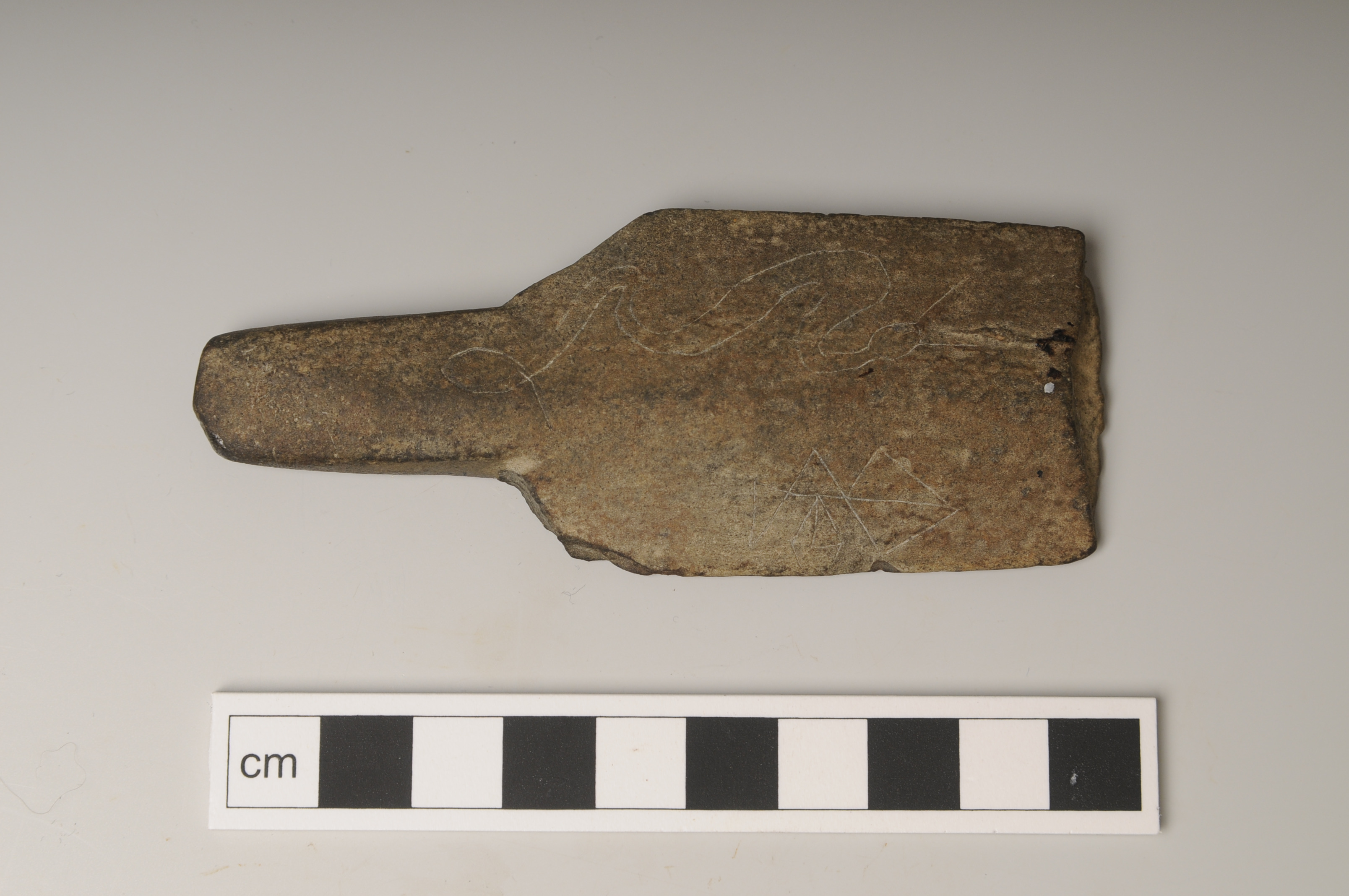 Skaftända till en spjutspets av skiffer med tånge och hullingar. På ena sidan finns en runinskrift, på den andra geometriska ornament, bland annat en ormfigur. Äldre runor som har tolkats som "bjzo-…". Inskrift och ristningar på spetsen är troligen av betydligt senare datum än då äldre runorna vanligen användes (romersk järnålder-folkvandringstid). Skifferpilspetsen kan vara från yngre stenålder-äldre järnålder