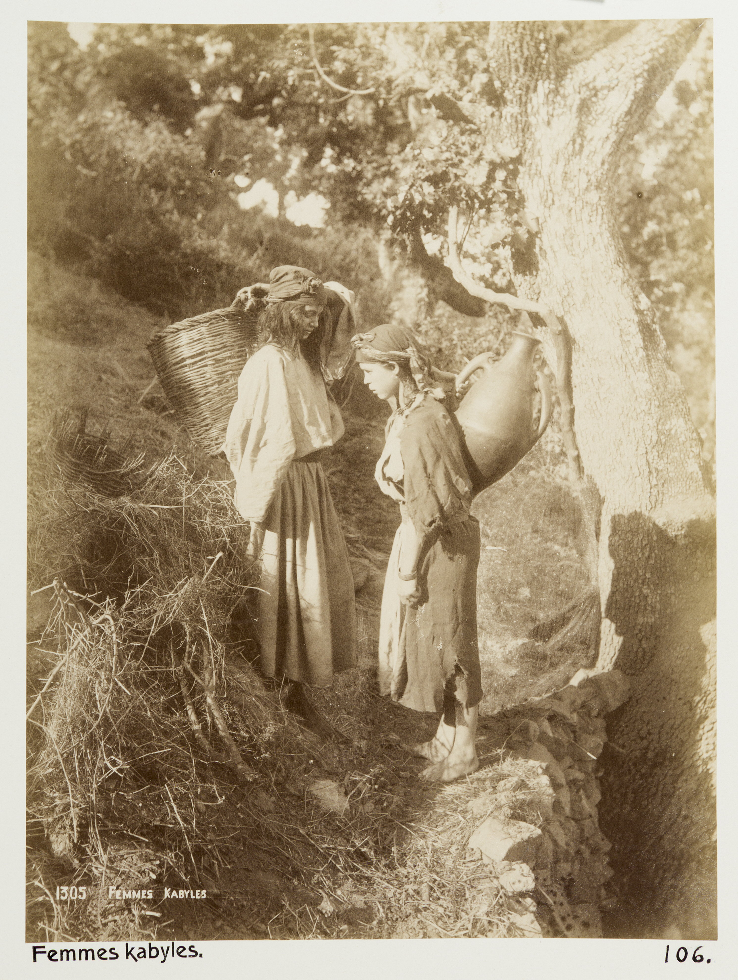 Kabyliska kvinnor, Algeriet. Bilden är en dubblett till LXVI:F.110. Bilderna med inventarienummer LXVI:K.H.01.-137. är inköpta av Johanna Kempe, f. Wallis, i Alger, Biskra, Tunis, Constantine, Oran och Blidah vid hennes vistelse i nämnda städer tillsammans med sin dotter och svärson, Wilhelmina och Walther von Hallwyl, dotterdottern Irma samt fröknarna Caroline Pflaum och Ida Uhse under deras resa genom Algeriet och Tunisien samt åter över Schweiz 11 februari - 19 maj 1889. Förestående uppgifter lämnade med ledning av fröken Ida Uhses Reseanteckningar. Vissa av bilderna är dubbletter till bilder i inventarienummerserien LXVI:F.01.-138. som köptes in av Wilhelmina von Hallwyl under samma resa.