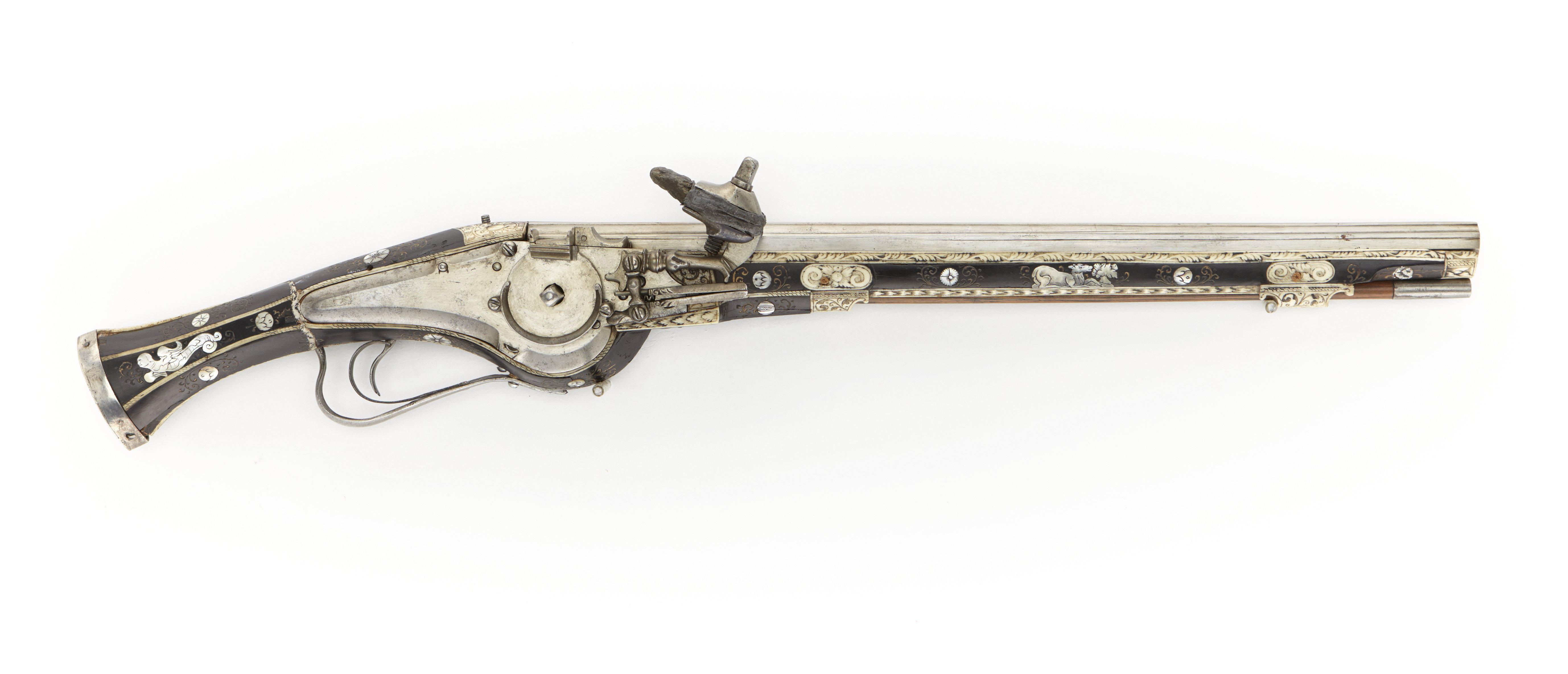Åttkantig, slätborrad pipa av stål. Ovamsidan med fyra lister på kanterna. Kammaren stämplad med Nyrnbergs kontrollstämpel (Stöckel nr 1584). På pipans undersida stämpel liknande timglas, möjligen ekollon. Två piphäften. Utan sikte och korn. Hjullås. Låsbleck med fasade kanter, avslutat i smal avrundad spets och nersvängt för hjulet. Hjulet fastskruvat med tvåtredjedels ring (runt nedre delen) kl. 9 och kl. 3. Låg, vertikal krutskärm. Hane med lös underkäke. På låsets insida nedanför hjulstudeln, stämpel med "HO" och struts. Hel stock, belagd med ebenholtz. Inläggningar av lister och plattor av ben samt pärlemoskivor - allt graverat. Stocken utsvängd för hjulet. Kolvkappa, spets oval, nästan platt, med graverat "HW" samt Wrangelska vapnet. Två låsskruvar, utan brickor, mellan dem och på sidorna därom jaktscen med figurer av pärlemo: jägare till häst med spjut jagar rådjur med hjälp av tre hundar. Runt jaktscenen benlist med konturer som låsblecket. Pipan fäst i rännan med två pipstift (ej ursprungliga). Pipstiftsbrickor bestående av ovala, graverade benplattor. Näsband och rörka av ben. Hjullåsvarbygel av stål. Avtryckaren insvängd, påverkar fjäder fäst i varbygeln. Tillbehör: Laddstock av brunt trä, ursprungligen svärtat, doppsko i form av gängat stålrör. Svavelkis i blykapsel. Märkt: 28, ovanför låsblecket, stanstyp 5376.