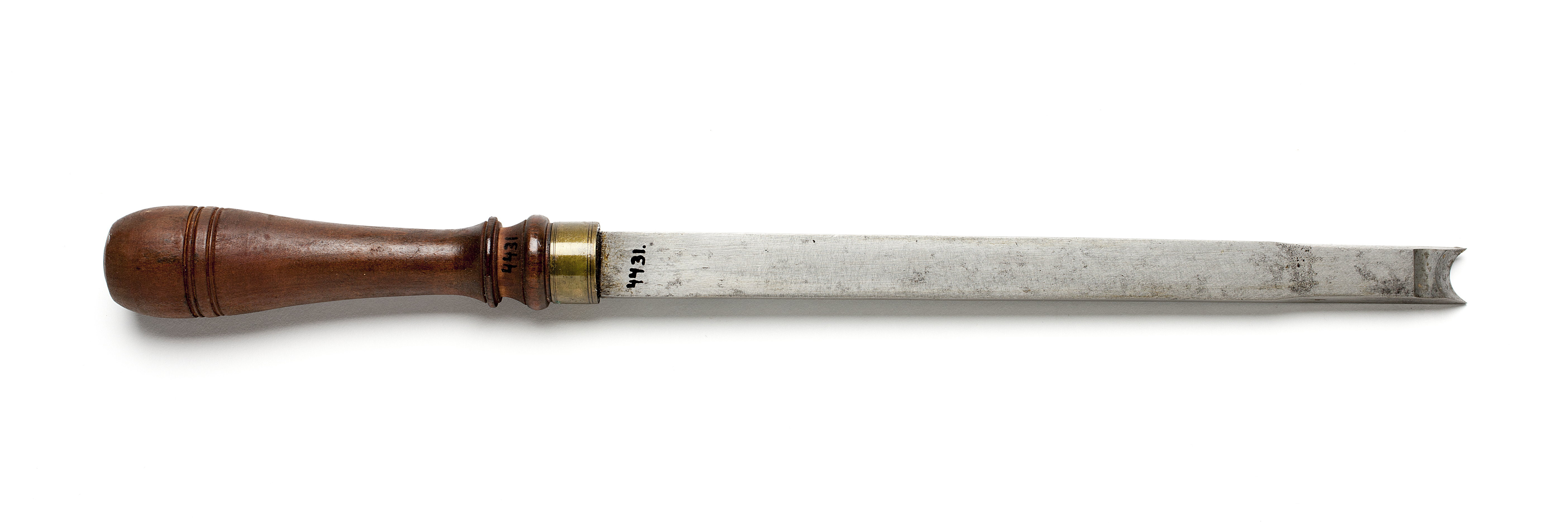 Klinga med rektangulär genomskärning. Rak, konkav egg. Stämplat på klingan: "IK" under krona, Johan Kesemaker, Stockholm, samt "P" (proberstämpel). Svarvat skaft av päronträ, med två vulster nedtill ("rydboholmstyp"). Mässingsring. Stämplat på skaftet: "NB" under krona.