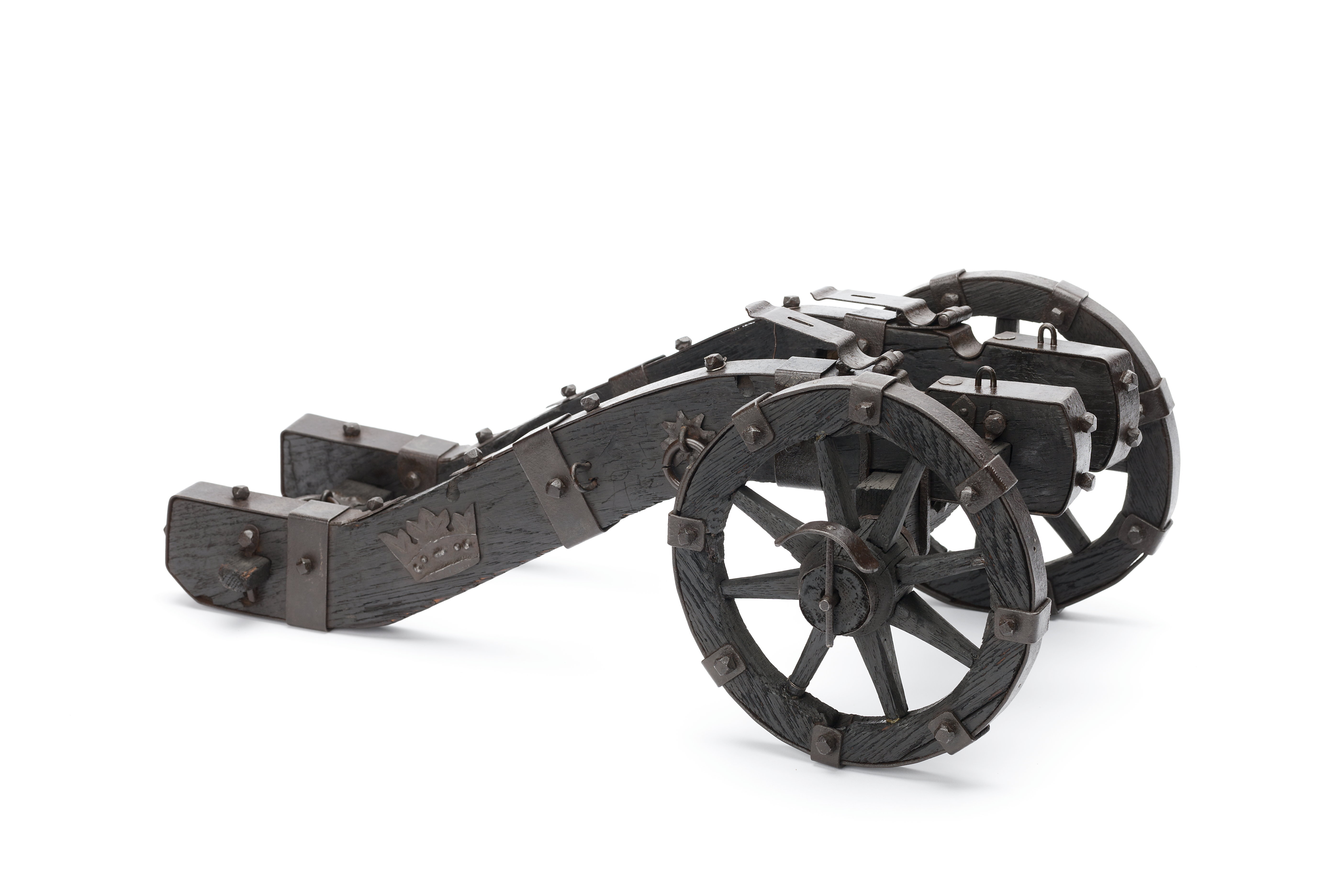 Lavett av svartbetsad ek med stålbeslag. Två s-formigt svängda, lodräta sidor, förenade med tre mellanstycken, hjulaxel, stöd för kanonröret samt bakstycke med ring för anspänning. Stålbeslagna hjul med åtta ekrar, sprint, den ena med svängt, bandformigt huvud. Stålbeslagen fästade med spikar med stora, fasetterade huvuden. På h. sida en dekorplatta i form av en öppen krona samt en märla, en ringa med platta i form av en åttauddig stjärna samt två bärhakar. På v. sida en sköldformig dekorplatta med sju spikhuvuden (?) samt en hjärtsköld. En bärring som på h. sida. Fästbeslag för kanonröret, uppfällbart med gångjärn och hål för låsbyglar, låsning med fjädrande stift (ett modernt). På h. sida bakom ringen otydligt ristat datum: "-0404- (( A1907".