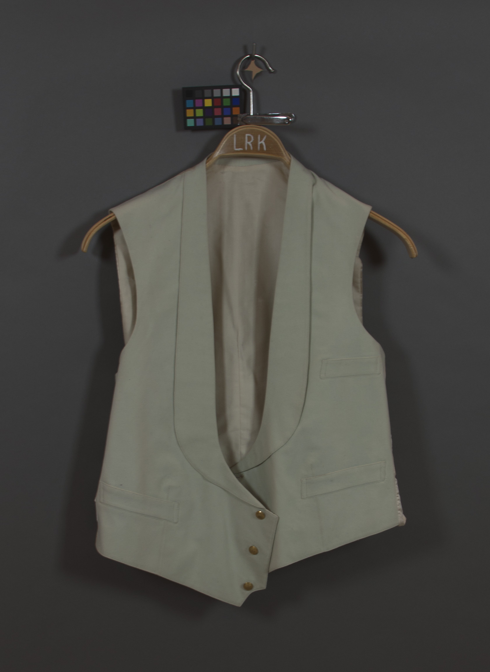 Väst av vitt kläde, krage med sjalslag knäppt med tre knappar av förgylld mässing d: 13 mm, med kunglig krona. En bröstficka + två nederfickor. Ryggstycke av vitt siden med spänntampar och rektangulär sölja av gulmetall med text: "PRIMA SOLIDE".