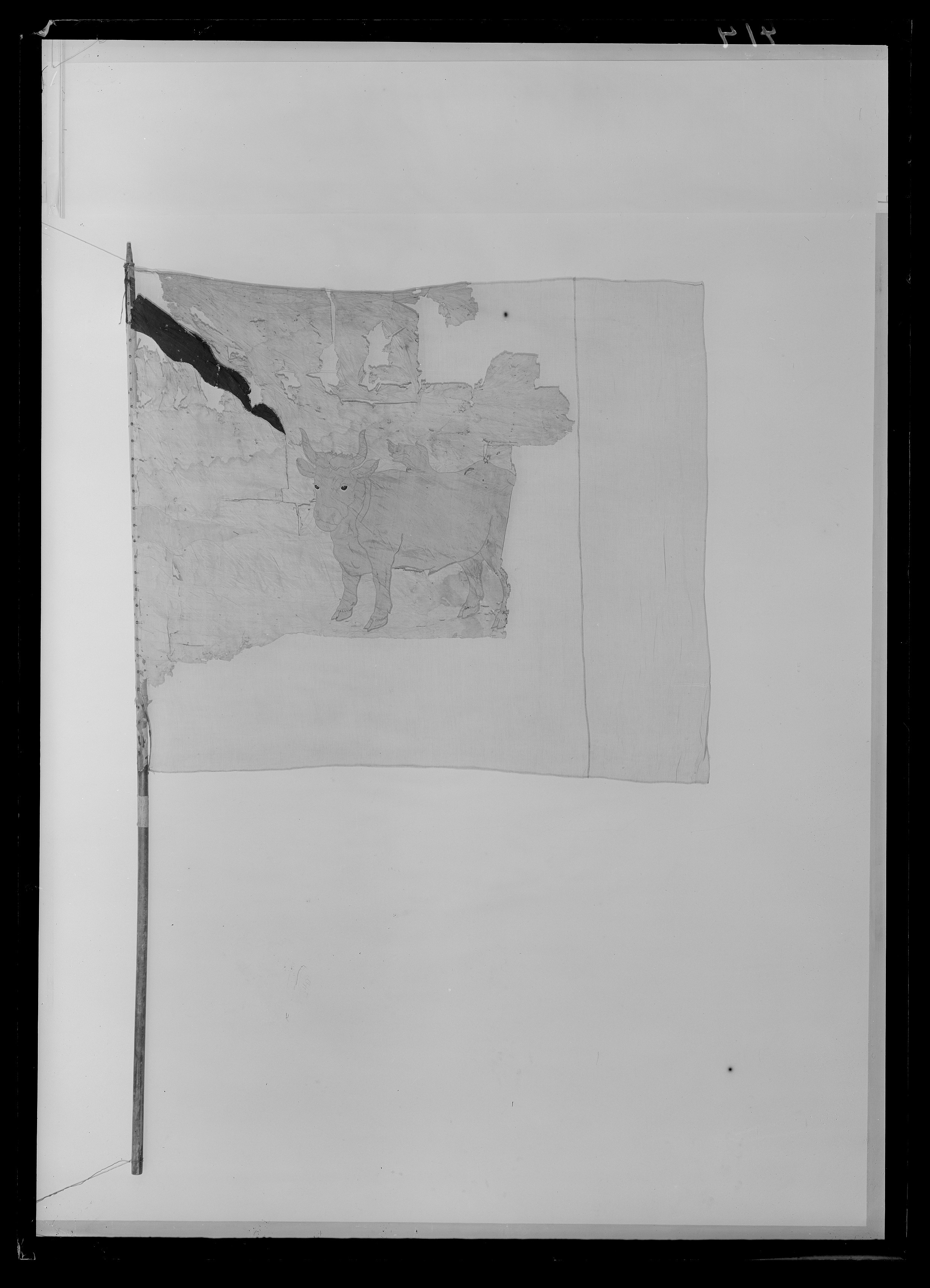 Duk av enkel vit taft. Nuvarande bredd ca 130 cm. Dekor: Insytt från kanterna, inåtgående flammor, svart från hörnen , gula från sidornas mitt. I mitten Dalslands sköldemärke. Duken fäst med rött sidenband och förgyllda spikar. Stång av furu. Märkt: På stången krigskollegii lapp? no 69. I stången inskuret W. Troligen förfärdigad av hovbrodören Leij 3 febr, 1779 hade hovbrodören Leij förfärdigat fanor åt regementet, men eftersom de inte var gjorda enligt modellen, ålades han att ändra densamma. Det är obekant om så skedde. Troligen är denna fana en av de omtalade - avvikelsen från modellen är att oxen framställts perspektiviskt framåtvänd.