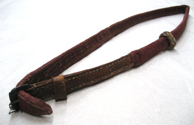 Rem av läder med ovansidan till stor del klädd i karmosinröd sammet, fram till ett läderparti 146 mm från spännet. Längsgående sömmar i kanterna, av beigefärgat snöre. I ena änden ett kvadradiskt spänne av järn, med något tillplattade sidor, en nål och löphylsa. Andra änden har en spetsformad avslutning. 17 synbara hål längs remmens mitt mot den spetsiga änden. Nedanför spännet en fast, sölja av läder för fäste av den spetsiga delen, fäst 22 mm från spännet, bredd: 12 mm. Rörlig, tvärgående och flätad rem av läder och beigefärgat och grått, tvinnat silkesgarn, bredd: 17 mm. Hela remmen ihopspänd i första hålet.