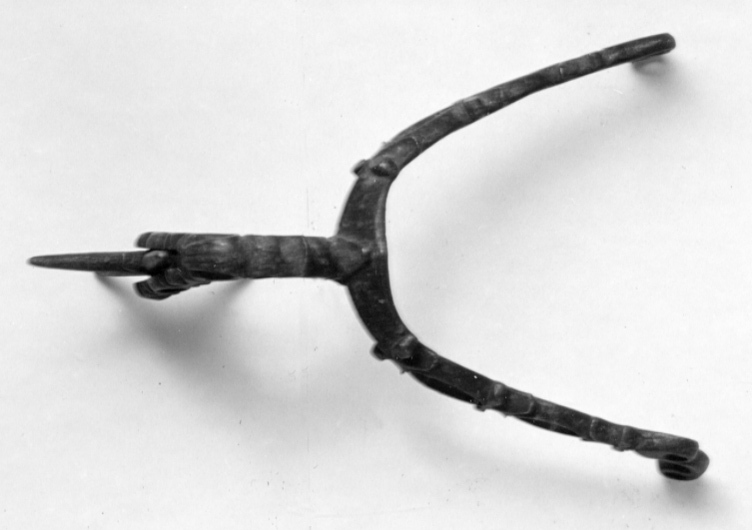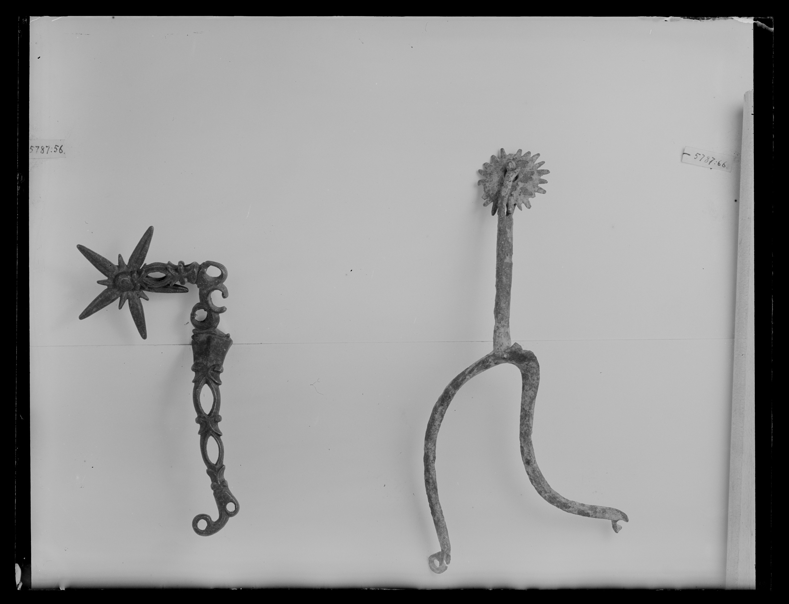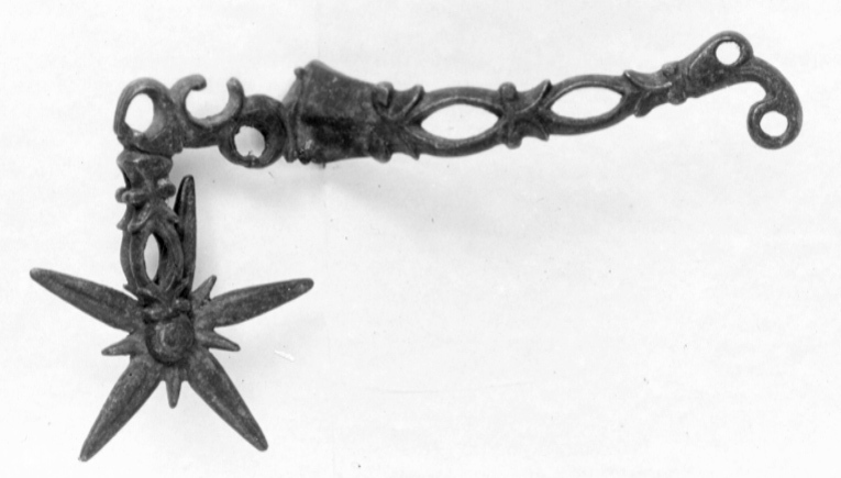 Sporre av stål. U-formade skänklar, obetydligt böjda, genombrutna i ovaler och ciselerade, ändarna böjda med två hål. Hals, l: 51 mm, genombruten och ciselerad böjd i vinkel. Femuddig klinga, d: 51 mm, med fem små uddar i mitten. Märkt på pergament: No 19.