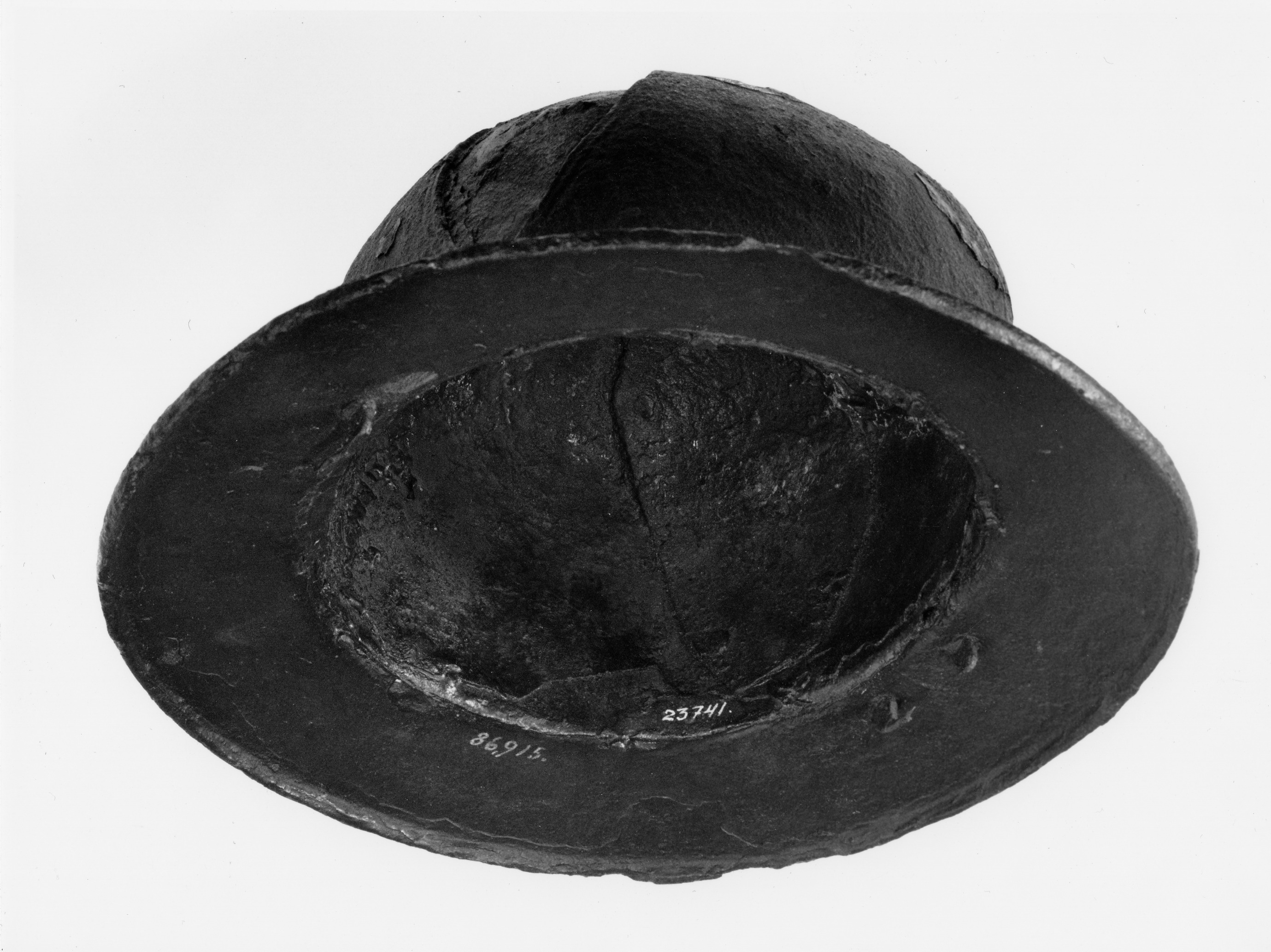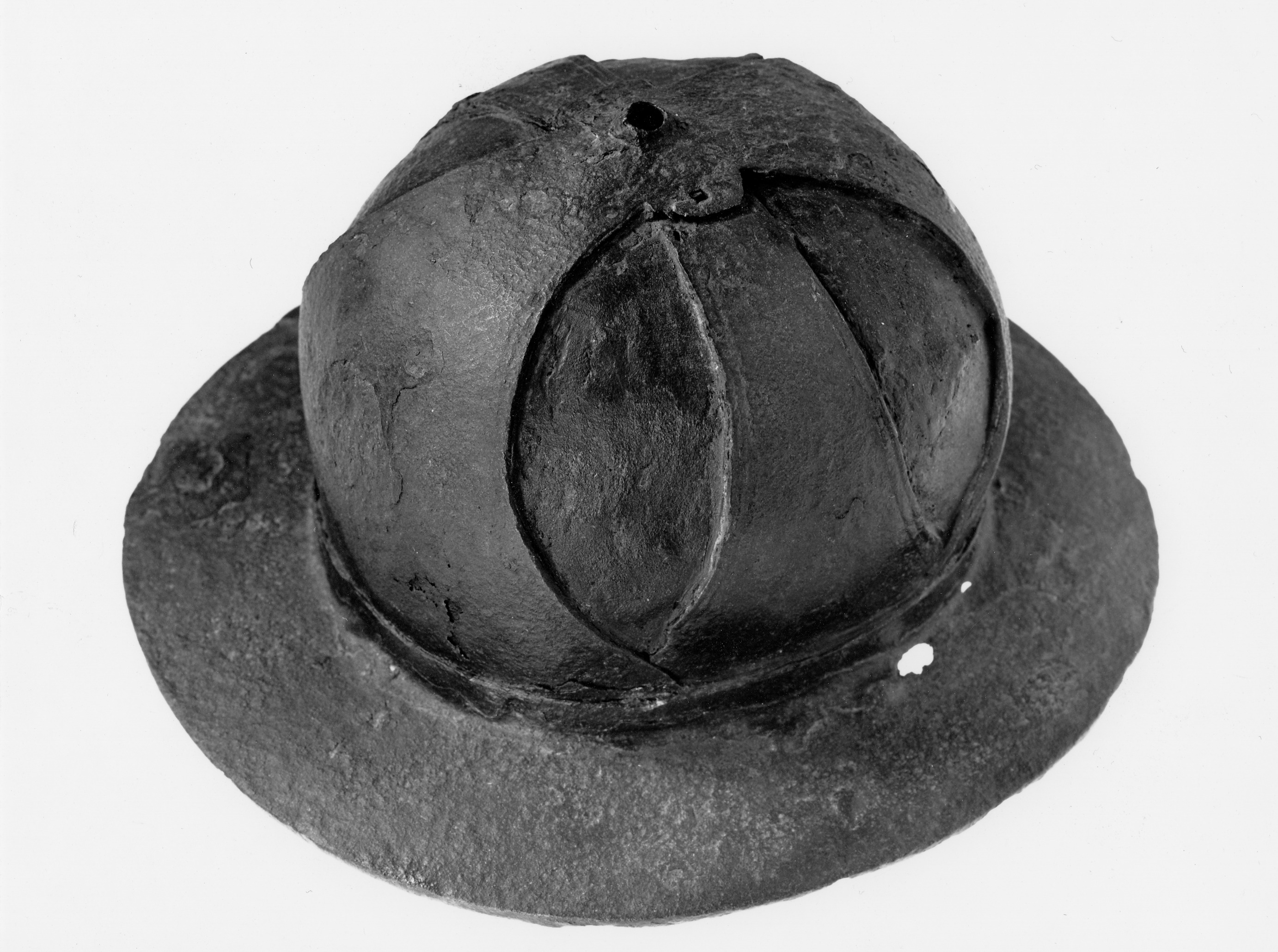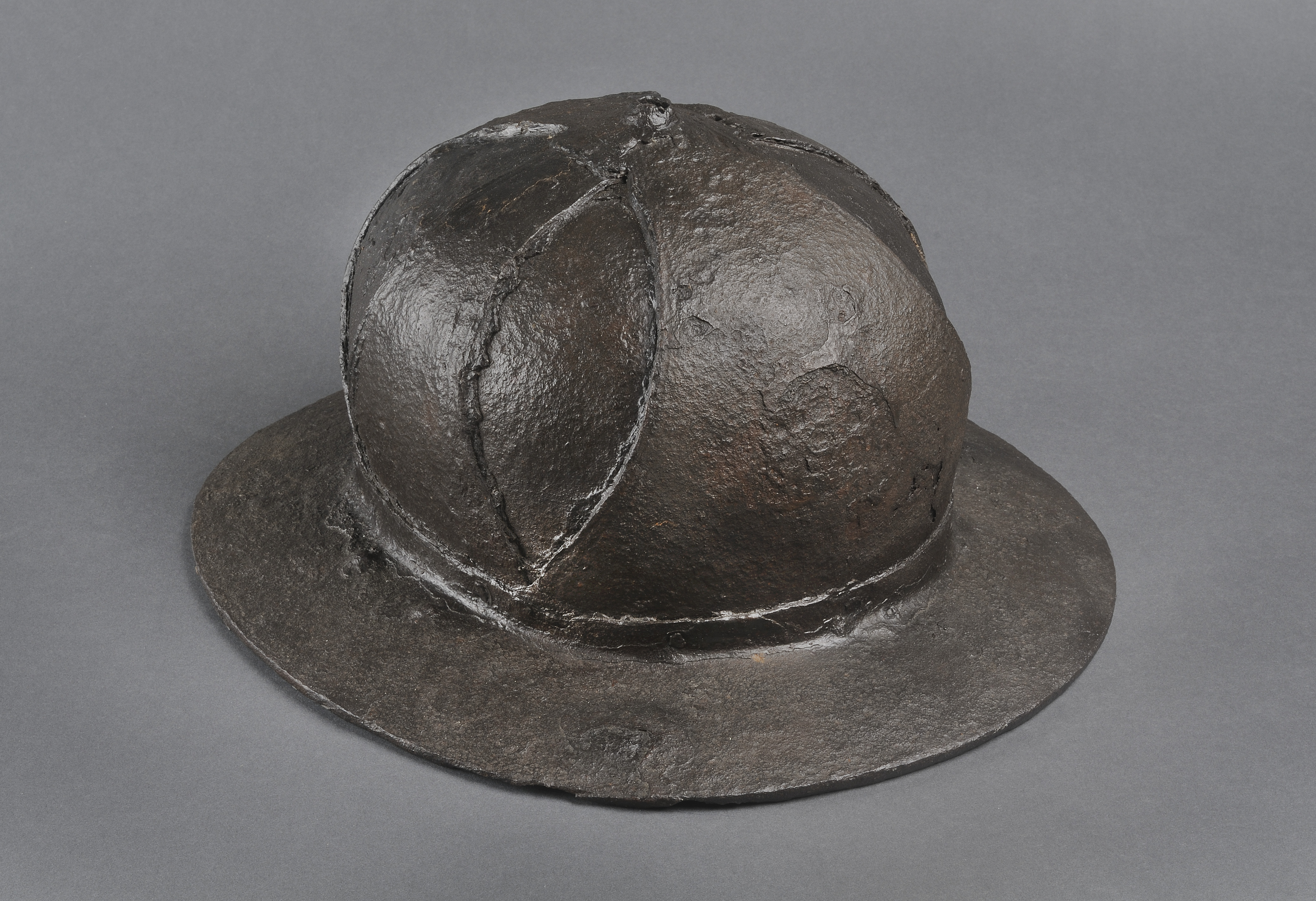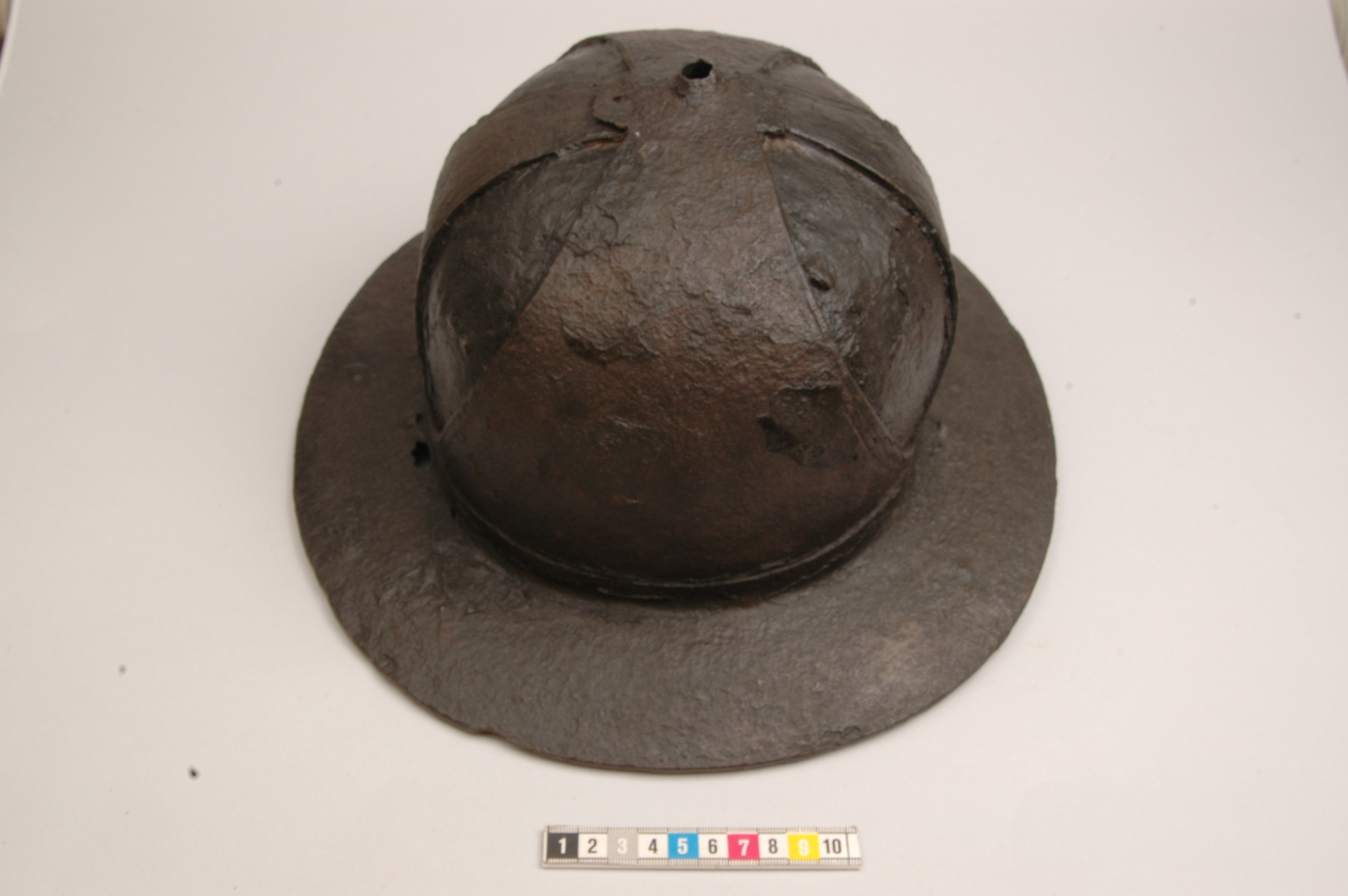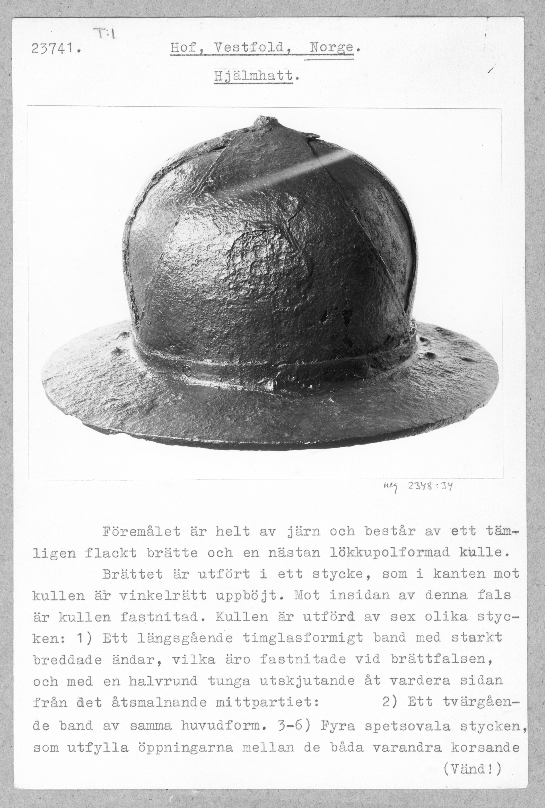 Norsk järnhatt. Liknande hjälmar finns avbildade på bl.a. helgonskulpturer.