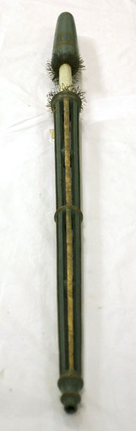 Lans av trä, bestående av kolv, handtag, framdel med holk och holkring. Lansen är målad i blått och guld. Bakåt avsmalnande, cylindrisk kolv med rundade ändar. Målad i blå grundfärg och dekorerad med grevliga ätten Gyldenstolpes hjärtsköld i form av en i blått fält pelare i guld krönt av en vit lagerkrans. Skölden krönt av grevlig krona. Handtag klätt med vit siden. I handtagets båda ändar finns guldfransar. Främre delen genombruten, svagt konisk med åtta längsgående ribbor, målade varannan i blått, varannan i guld. I ändarna och på mitten svarvade ringar. Förstärkningsstycken på varje halva i form av utsparade kulor, något försänkta under ribborna. Vidhängande rektangulär lapp med text: "Gripsholm 1945 // nr II: 7 // Gr. N. el. U. Gyldenstolpe // Drottningholm // 1799 el. 1800". Balusterformig, svarvad holk i blått och guld, med en blåmålad holkring. Framringen genomborrad av ett runt hål för fästning av spetsen. Använd av greve Nils Gyldenstolpe (1768-1834) eller av greve Ulrik Gyldenstolpe (1774-1855) vid tornerspelen på Drottningholm 1799 eller 1800.