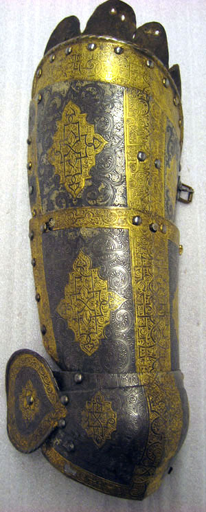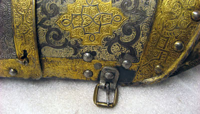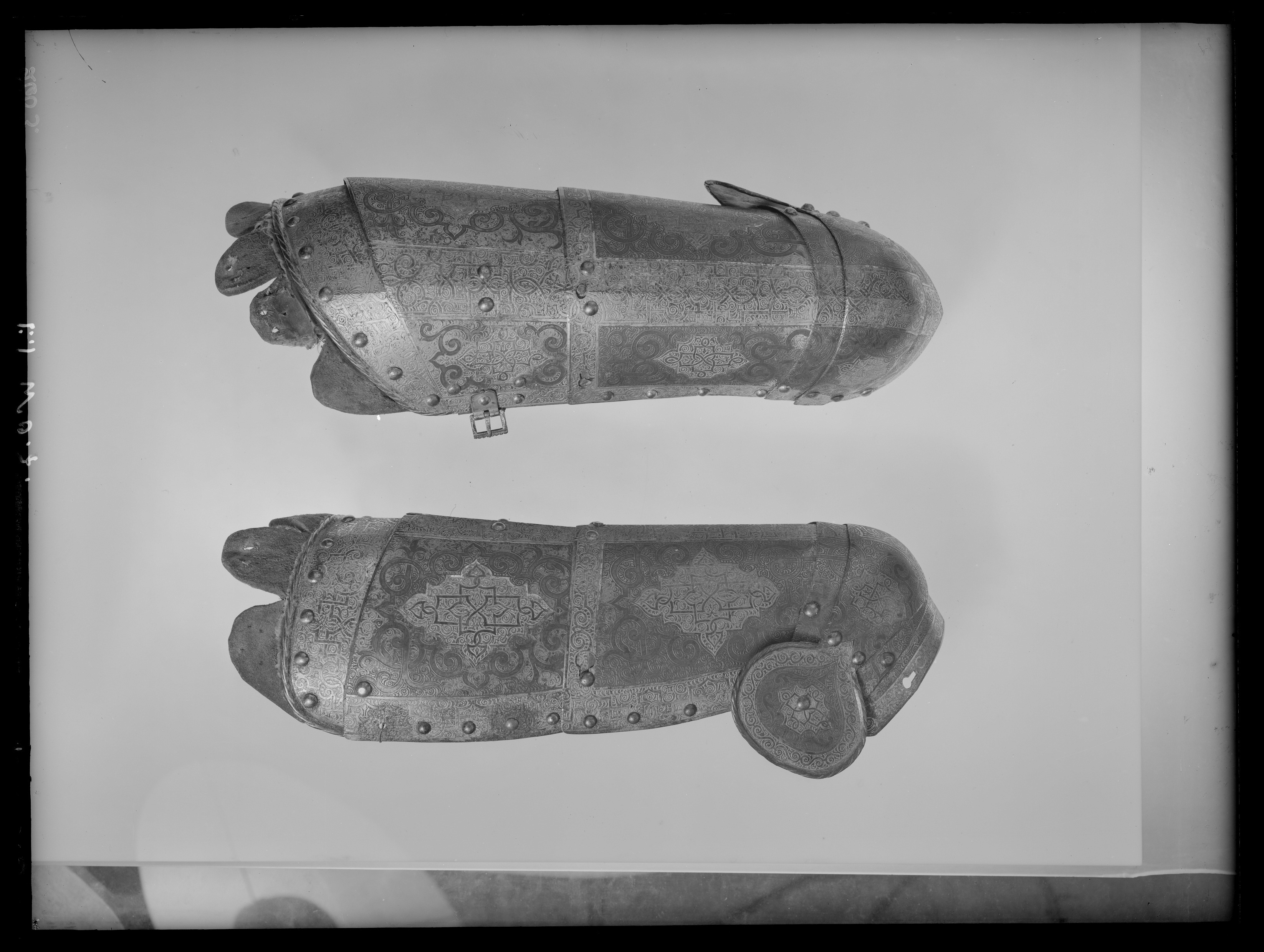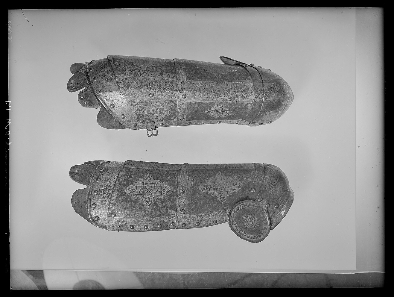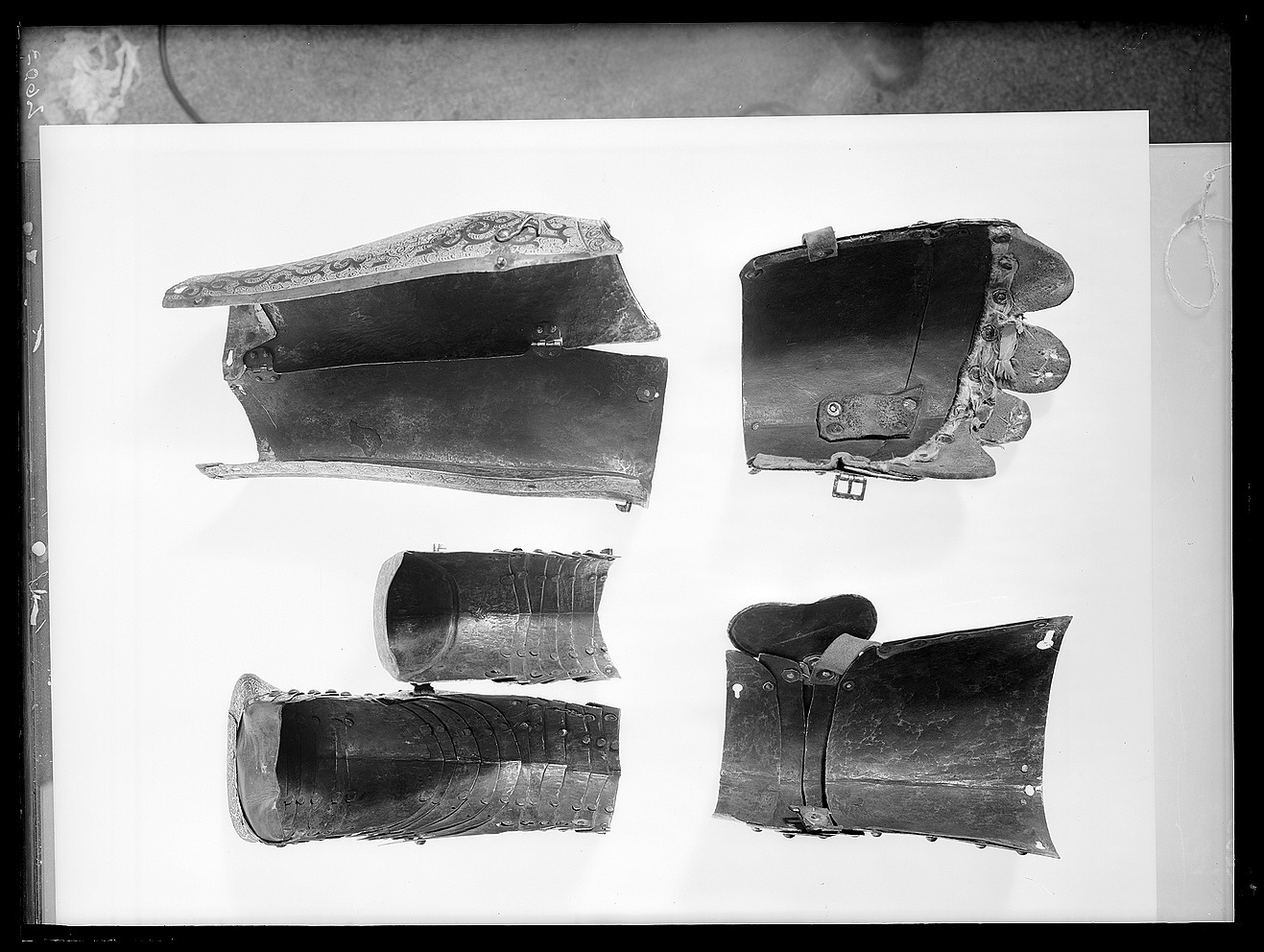 - 1 rustning af jern, helt och hållet etsad i ornamenter, hvilka äro dels förgyllda dels ifyllda med en hvit massa, rustningen, som uppgifves hafva tillhört konung Christian II, består af: hjelm i 5 delar med slutet visir, hakbetäckningen att öpna på midten, kammen hög, starkt bakåtsluttande, för hjelmbusken en hylsa, muttern på ena sidan af visiret jemte knappen till fjedern på öfre visiret borta, hjelmen invändigt fodrad med stoppning, öfverklädd med sidensars,