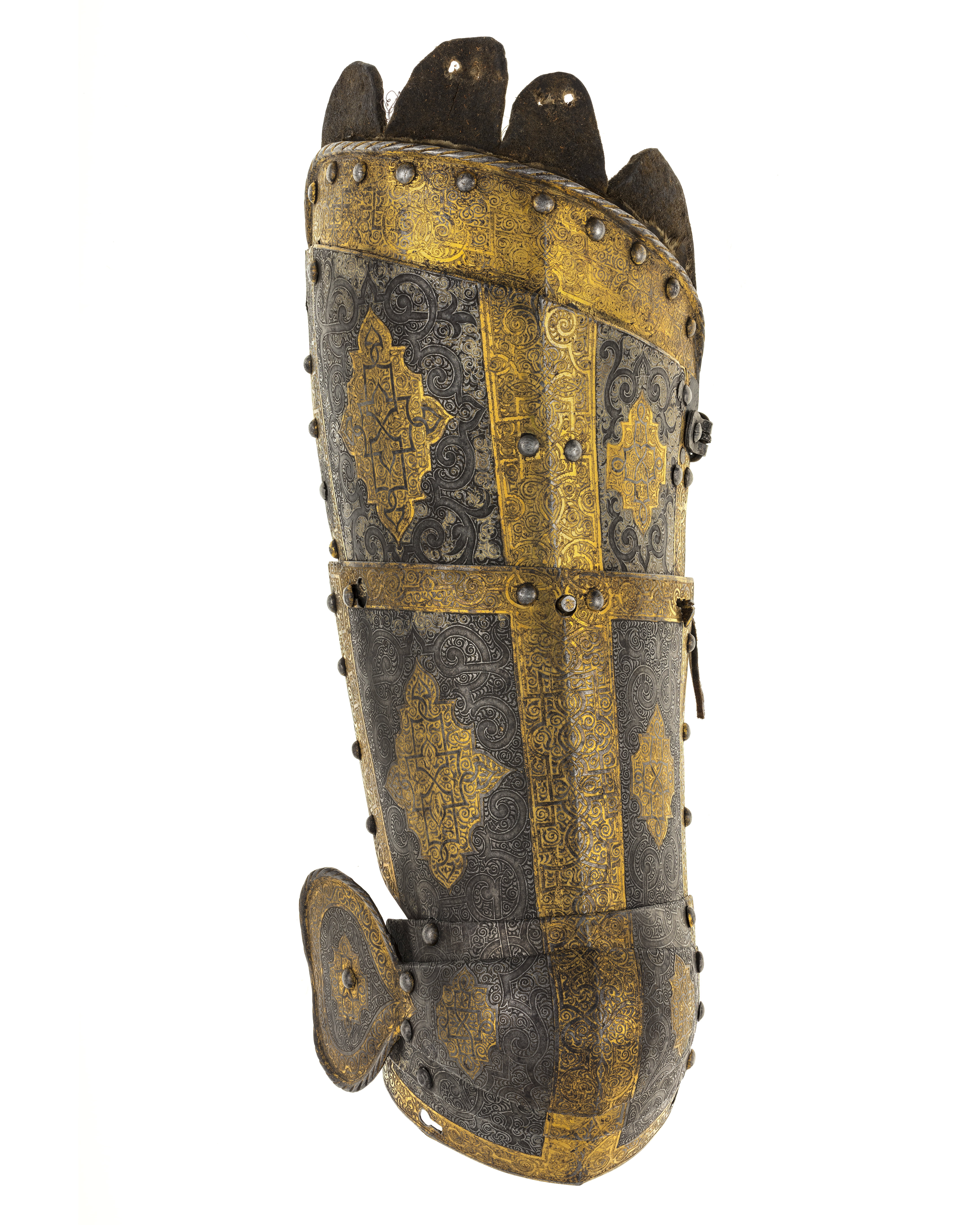 2 Complette Armstycken af drifvit incrusterat Jern med Guld och Silfver