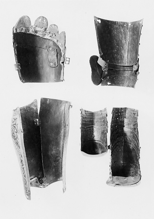 bröstharnesk med rörliga betäckningar för axelvecket, 2:ne slöjor och tornerhake med ledgång, bukbetäckning i 3 delar, fästad vid bröstharnesk, 2 lårlappar, hvardera i 4 delar med 2:ne slöjor, ryggharnesk med höftbeteckning i 2:ne delar och 2:ne rörliga spännskenor,