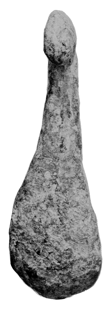 Bälthake. Svagt böjd. Med tvåfasad framsida och avsmalnande mot halsen, denna omböjd som hake. Kroppen med rundad avslutning. Baksidan platt. På kroppen en rund knapp på kort, grov hals. Längd: 3,1 cm., bredd: 1 cm.