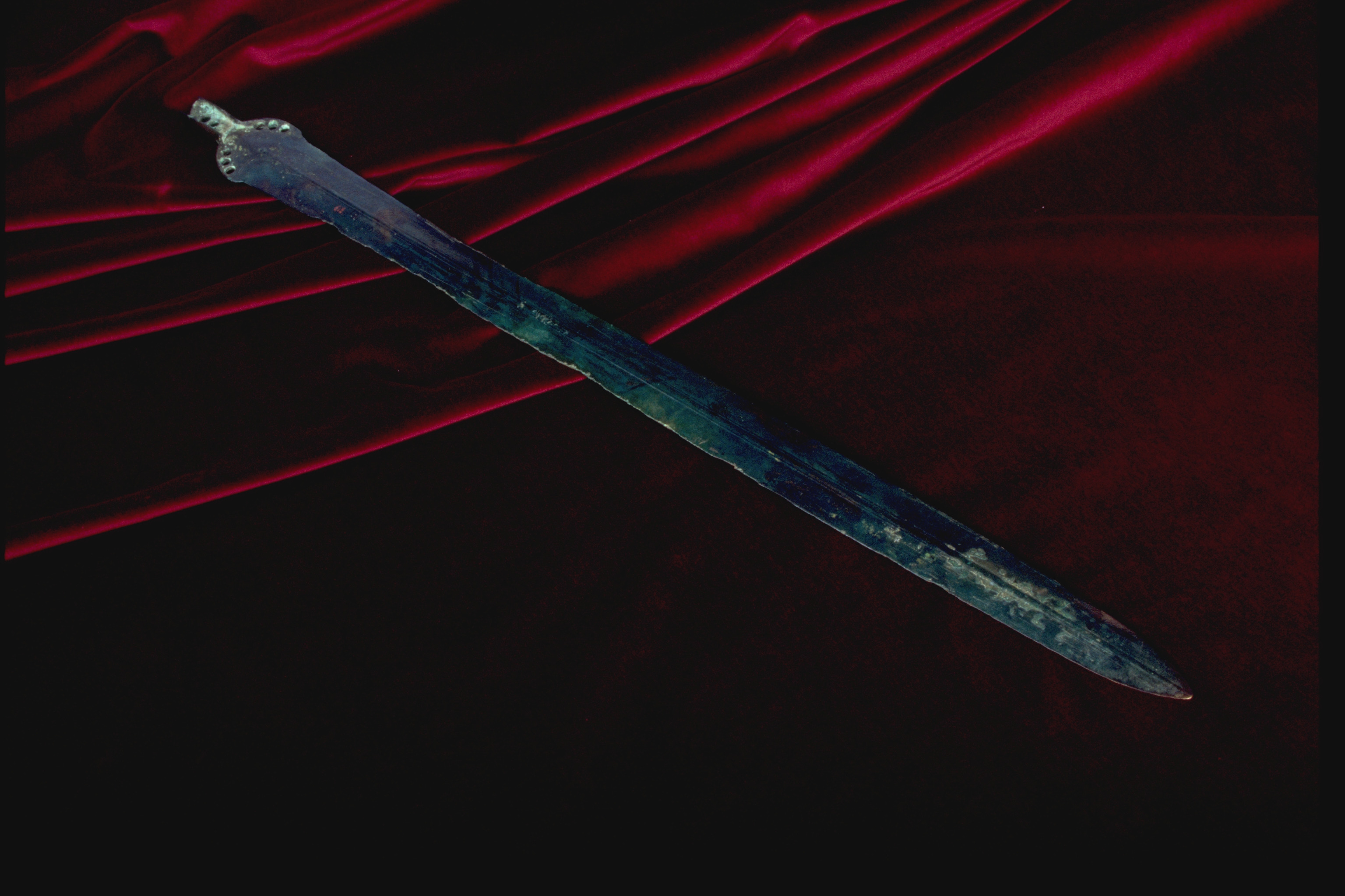 Svärd av brons. Har skafttunga. Svärdsfästet har varit fastsatt med två nitar i tungan och sex nitar i klingans översta del.