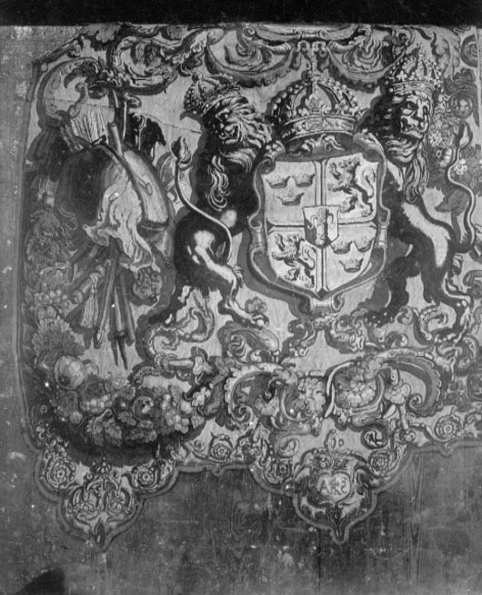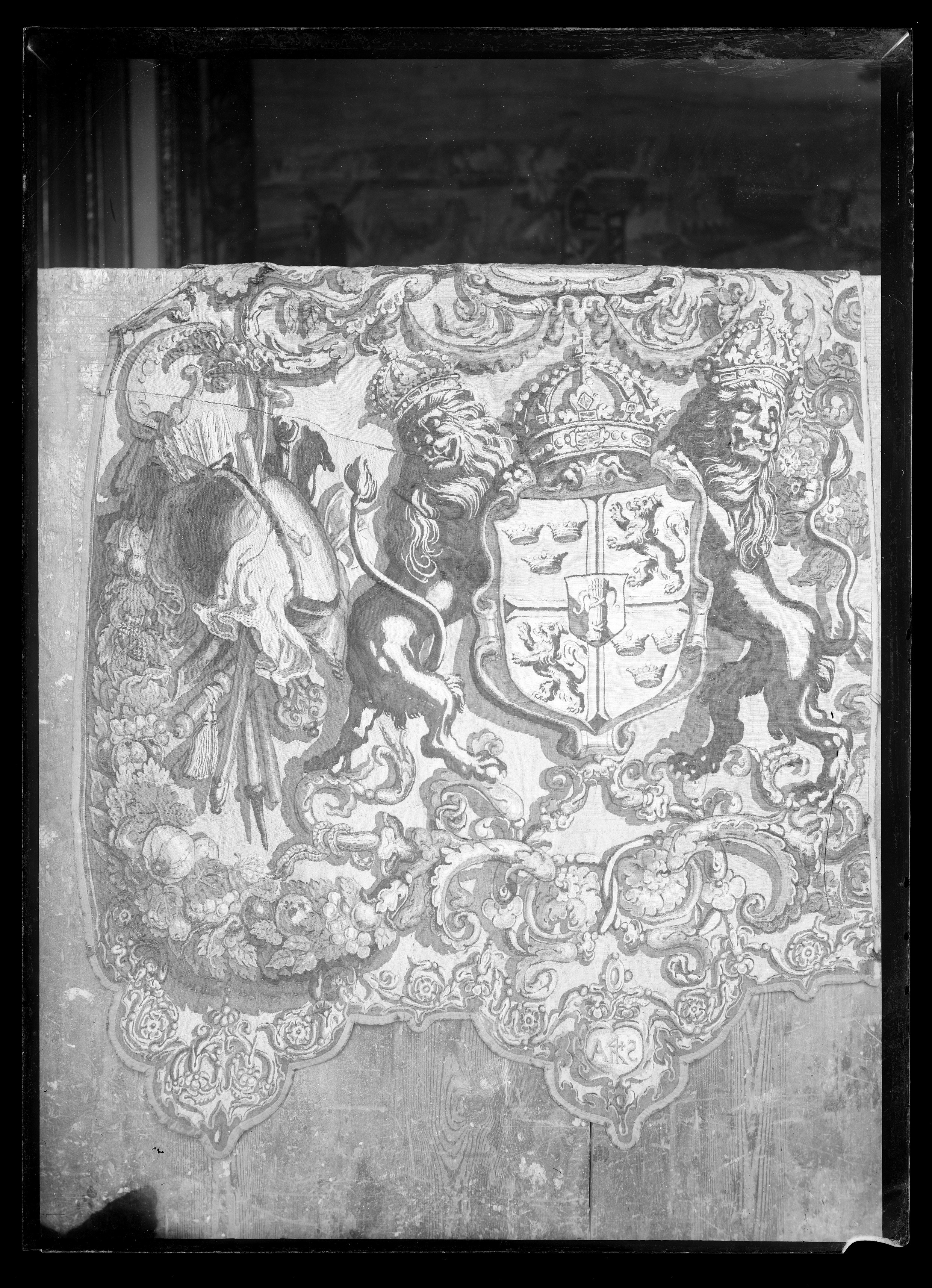 Haute lissevävnad av ull och silke, röd bakgrund. Söm längs mitten, sprund 165 mm långt, 130 mm brett mot bakre kanten, ca 80 mm från öppningen en ca 430 mm lång intagning. Från mittsömmen spegelvänt mönster med svenska stora riksvapnet med hjärtsköld Vasa, sköldhållare två krönta lejon på ett postament av korslagda kanoner. Mot bakre kanten en rustning, hujälm och gevär, h: 900 mm. Riksvapnet i ljusblått, lejon i ljusare och mörkare nyanser brunt, kanoner i brunt och rustning i beige, brunt och blått. Längs sidorna, som har två stora uddar, ca 200 mm som högst, en blomranka i blått, beige och brunt. På främre vänstra udden i en hjärtform i beige bokstäverna ANO. I främre vänsra udden i en hjärtform siffrorna 1621. Alla sidorna kantade med brunt linne, ca 10 mm bred. Höger sidas framkant har 3 st 180 mm lnga beige bomullsband fastsatta på 200 mm avstånd. På vänster sidas framkant 2 st, ett rött och ett beige bomullsband.