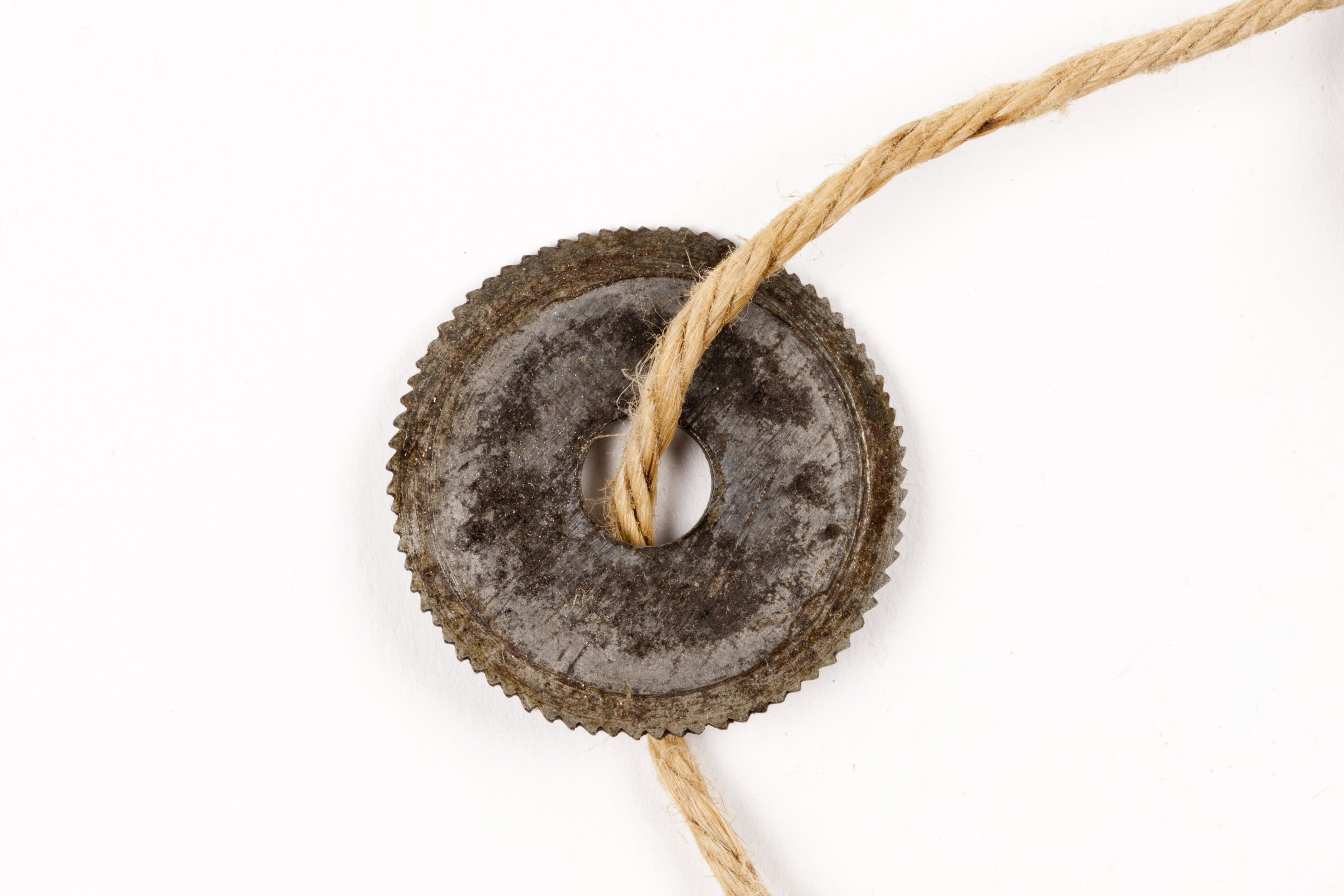 Rund, tjockare mot mitten. Tvärgående räfflor. Hålets diam 7,3 mm. Stämplad med en punkt.