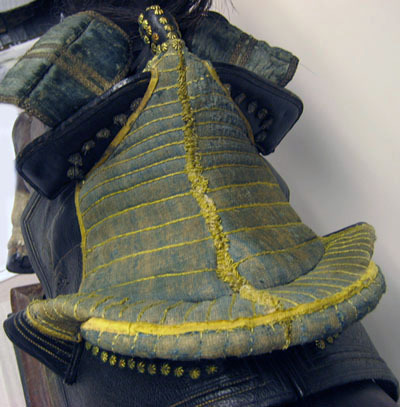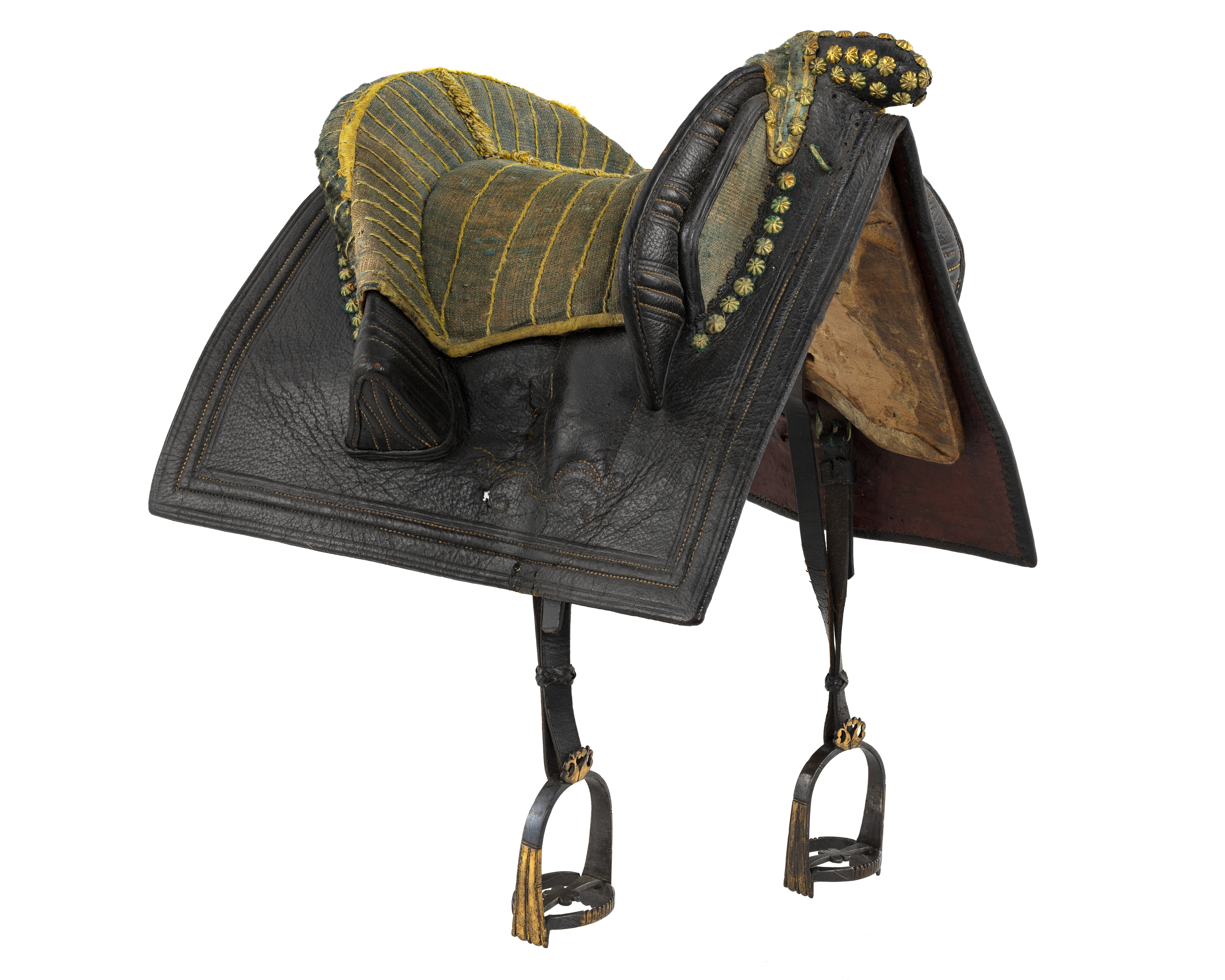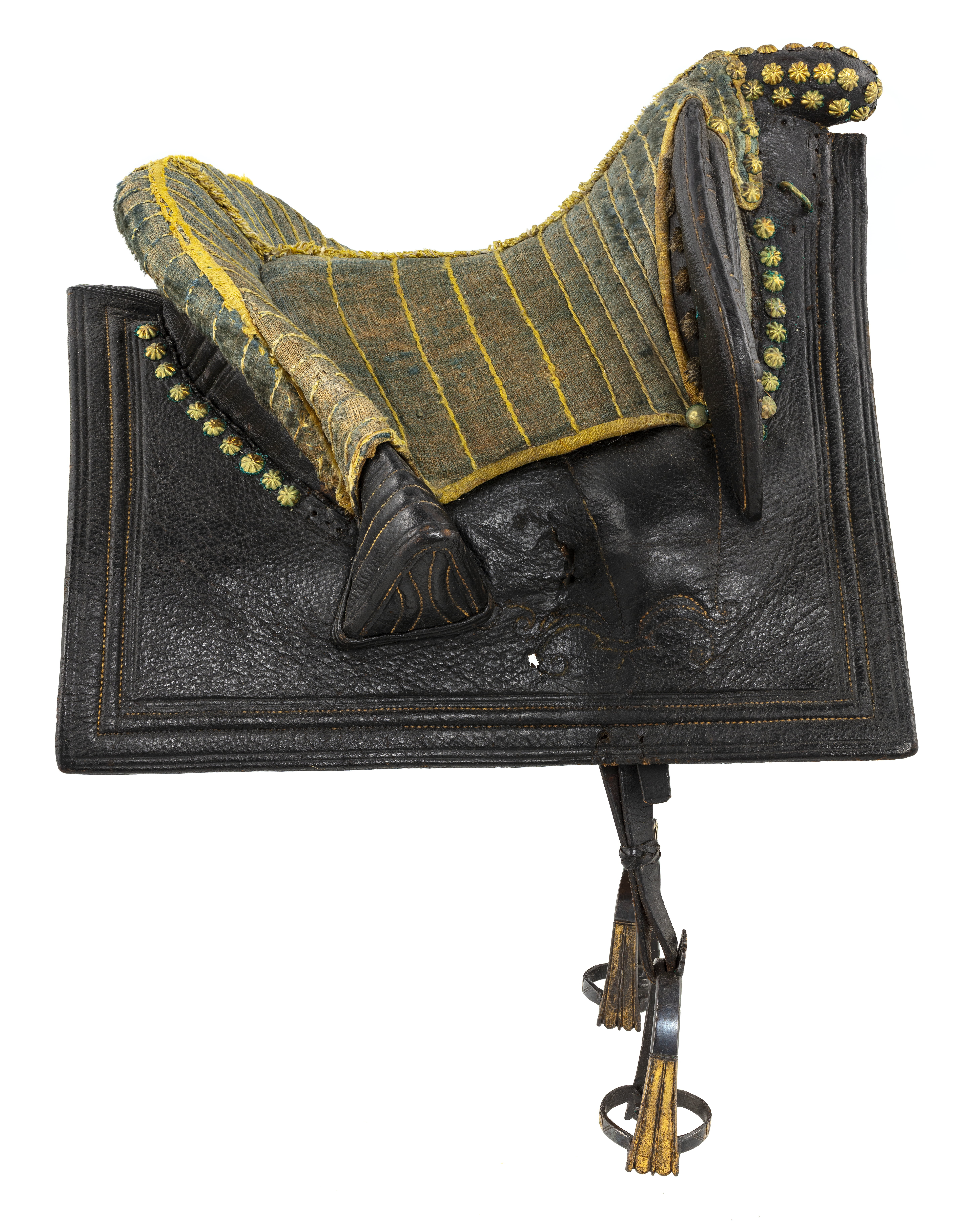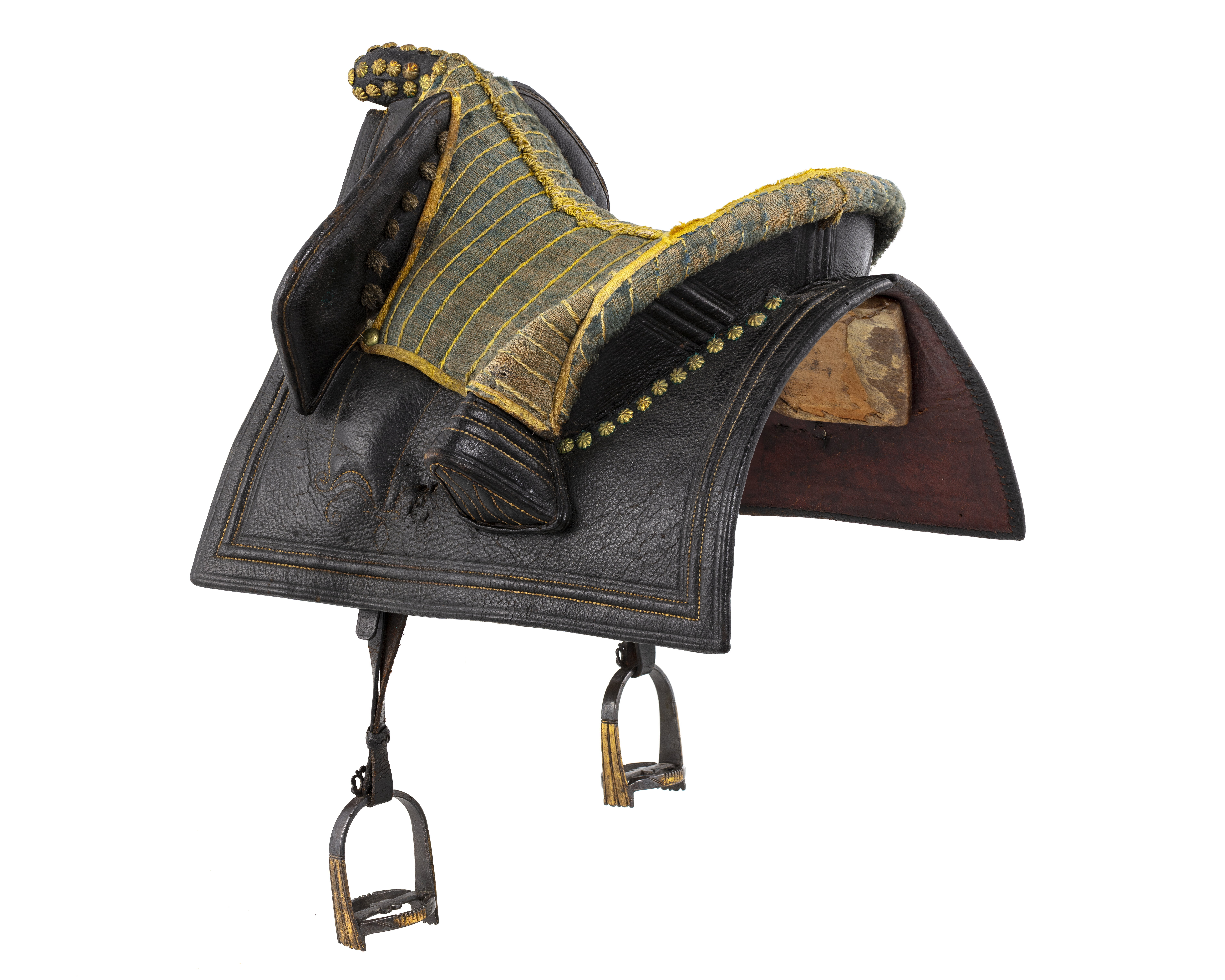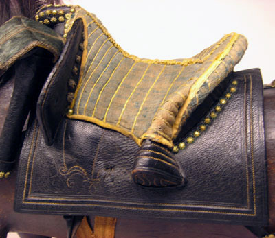Bomsadel med stomme av trä. Bakbom klädd med svart läder, dekor i sidor och mitt på av pressade linjer. På frambommen dekor av pressade linjer med med gul söm, sattta i tre grupper på varje sida. På insidan sex tofsar av skuren ylle. Oval knapp med rundad ände, övertäckt med blomformiga mässingsnitar. Sittytan klädd med blåflammig linnelärft med tydliga vertikalt ställda sömmar av gul silkestråd. Längs kanter och över mitten ett band av gult silke och silkestråd. Svansrem av svärtat läder. Sidorna bildar ett V med i spetsen ett cirkulärt platt beslag, kanten formad som åtta blad och åtta spetsar, placerade vartannat. I mitten konisk åttasidig spets. Runt svansen en U-formad rem.