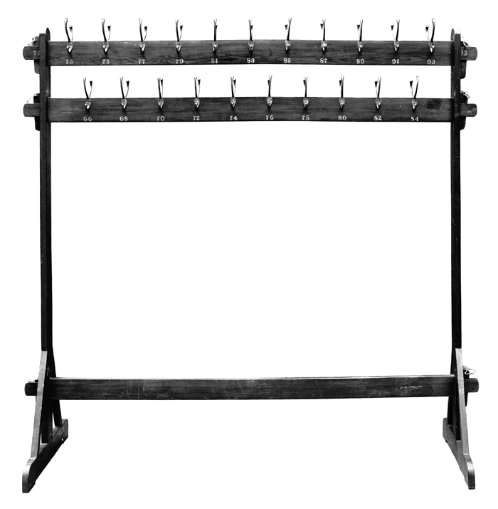 KLÄDHÄNGARE, åtta stycken. Av furu, brunbetsad, med krokar av mässing. Varje bestående av två vertikala ståndare, vardera med ett tvärgående fotstycke, mellan detta och ståndaren på vardera kanten en snedställd stäva (stötta). Ståndarna sammanhållna av tre kantställda slåar, en nedtill och två upptill. På de båda övre slåarna S-formade släta krokar av mässing. Varje krok med sitt respektive nummer, målat med vit oljefärg, de udda numren på övre slån, de jämna på den nedre. Höjd:1,85 och 1,9 m. Bredd två stycken: 2 m, fyra stycken: 1,745 m, två stycken: 1,5 m. Förfärdigad efter beställning av Wilhelmina von Hallwyl februari 1899 hos snickare C.H. Benckert J:r, Stockholm.