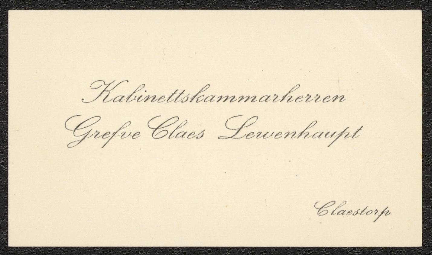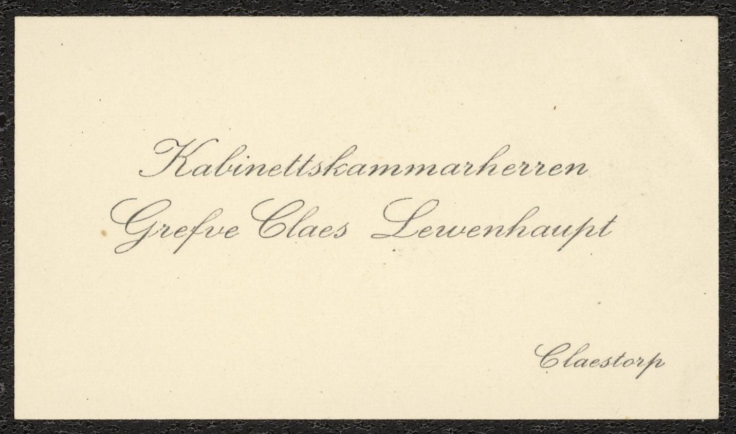 Två visitkort från Kabinettskammarherren greve Claes Axel August Lewenhaupt. Första kortet daterat 1926 vikt i övre högra hörnet. Adress (nedre vänstra hörnet) Claestorp. Andra kortet daterat 1926 vikt i övre högra hörnet.