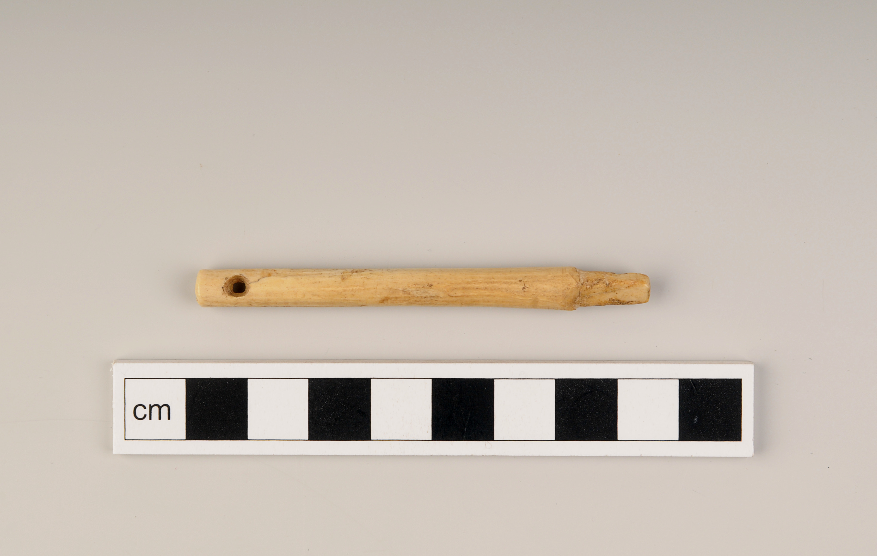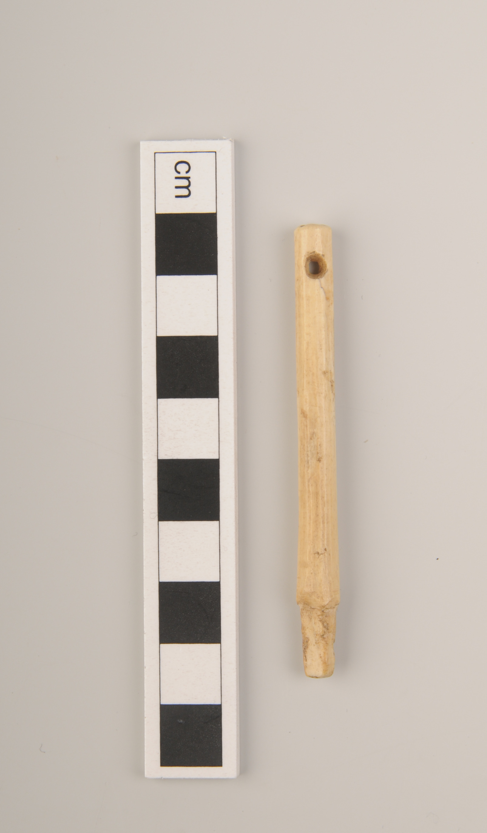 Medeltida stämskruv till stränginstrument, tillverkad av ben (ev metapoden från en stor hund eller varg?) Cirkulär med slipad och putsad yta. Skaftänden är rakt avskuren med ett borrat hål 5 mm från toppen, genom vilket strängen kunde löpa, i andra änden ändras tvärsnittet till kantigt ca 1 cm från slutet, änden avsmalnar något längst ner.