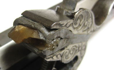 Gulgrön flinta, rektangulär med grovt slagna kanter. Vänstra hörnet avslaget och saknas. Infattad i en mantel av gråaktig blyplåt formad efter hanens käkar.