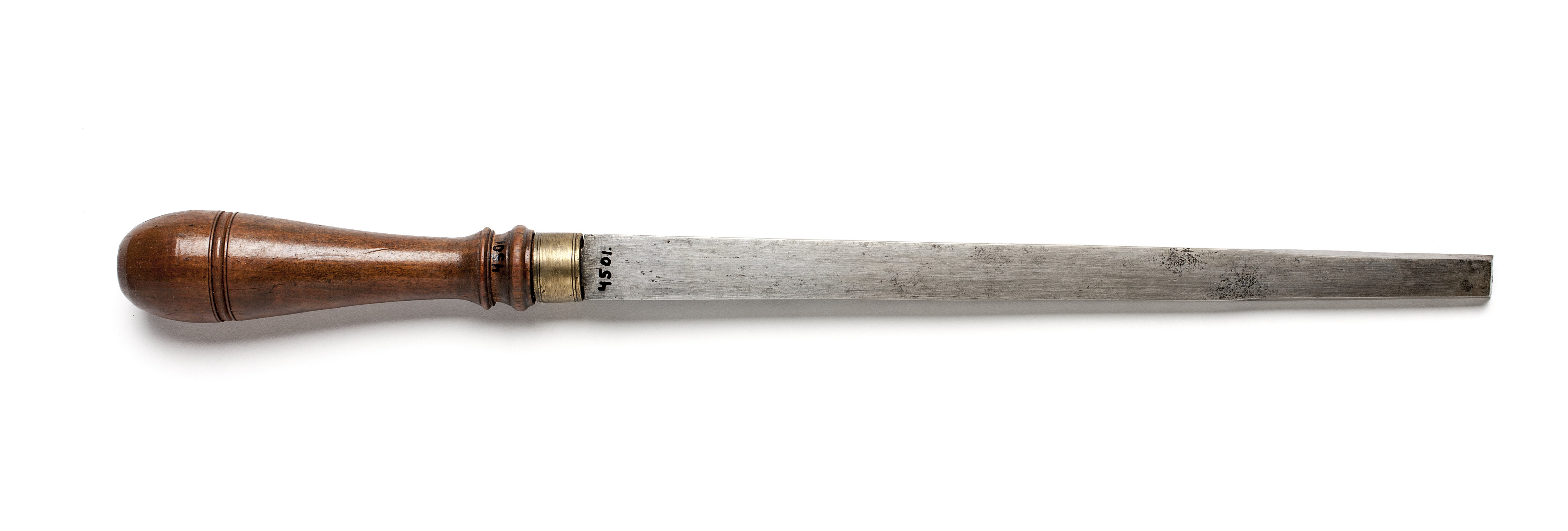 Klinga med rektangulär genomskärning. Stämplat på klingan: "EP". Svarvat skaft av päronträ, med två vulster nedtill ("rydboholmstyp"). Mässingsring. Stämplat på skaftet: "NB".