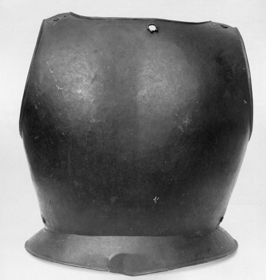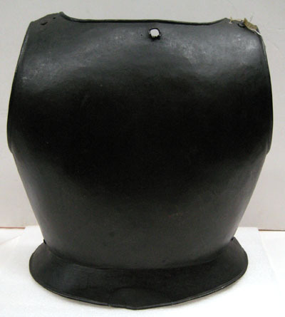 Av stålplåt i ett stycke, tunnare gods. Både ut- och insidan svärtade. Närmast rakt nackparti. Avlång grund urtagning för nacken. Axelbredd 50 mm. Rundade urtag för armarna. Kanterna omvikta inåt och rundsmidda. Nertill snett utåtriktat skört, B 60 mm i mitten. Förhöjningar över skulderbladen och försänkning mellan dem. Nitar över axlarna och i sidorna. I nackens mitt ett från insidan slaget hål, diam 11 mm.