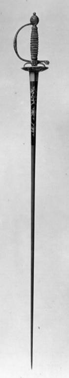 Fäste av stål genomgående snidat i låg relief och delvis genombrutet. Knapp nötformig med genombruten ornering av runda fält. Nitknapp tämligen hög. Handbygel med vågformat mönster mittpartiet genombrutet. Bakre parerstång med nedåtböjd droppformig ytterände. Bågformiga fingerbyglar. Kryss på båda sidor med genombruten femuddig blomma. Parerplåtar njurformiga något uppåtböjda, genombrutna. Kavel med mjukt rektangulärt tvärsnitt lindad med tämligen brett lan av stål och tvinnad ståltråd. Upptill och nedtill en flätad krans av mycket tunn ståltråd. Klinga tresidigt slipad s.k. stukatklinga. Starka delen blånerad och ornerad med etsade och förgyllda ornament. På klingans insida en stående gestalt beväpnad med ett svärd.