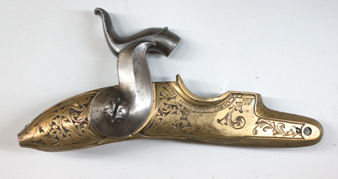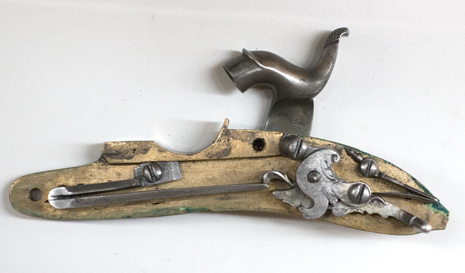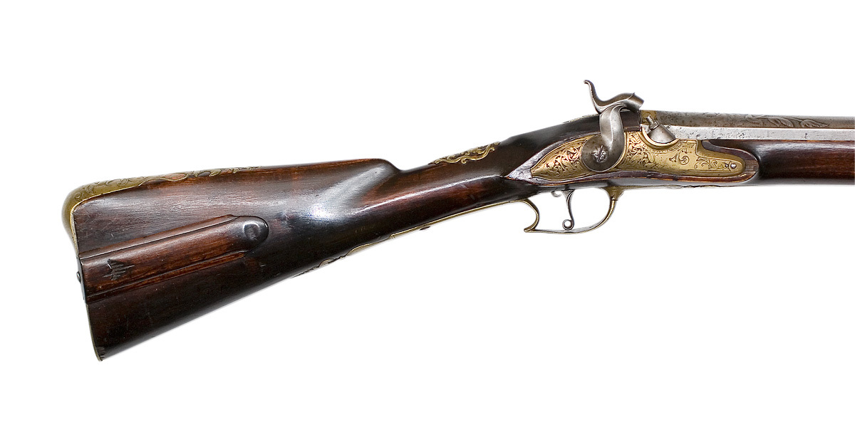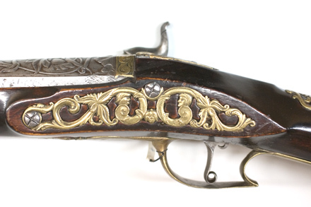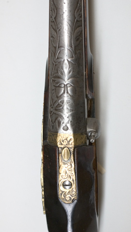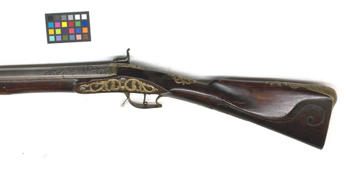 Rund, slätborrad pipa. Kammarstycket kantigt på undersidan. På kammarens översida bladornament och groteskansikte i relief. Längst bak tvärgående band av mässing, svansskruvbladet av mässing, båda med volutdekor. Ungefär från mitten och fram till mynningen en ribba på pipans översida med graverad text: " AO 1725 JONKIOPING ". På kammarens h. sida tändhattssnäcka. På pipans undersida Jönköpings kontrollstämpel samt A. Riktmedel: På svansskruvbladet klack med skålat sikte. Stolpkorn av silver med framåtriktat blad. Fästning: Två häften. Pipan fäst med krysskruv samt två pipstift av stål. Flintlås, omgjort till slaglås. Välvt låsbleck av mässing med graverad volut- och rankdekor. Hane av stål med mittås, nätskuret tumgrepp. Hanskruv med välvt huvud, maskaron i stålsnitt. Nedanför fängpannan graverat på band: " I. ENGVALL ". Fästning: Två låsskruvar med krysskåra. Avtryckare med upprullad ände, flikig skärm. Brun helstock av mörkbetsat trä. Kolv av fransk typ med kindstöd och kolvlåda. Kolvlådelock med snidad, profilerad kant och solfjäderformigt fingergrepp. Näsband av horn, övriga beslag av mässing. Bakplåt med flik på kolvryggen, groteskansikte och rankor samt avslutad med palmett. Tumplåt och sidbleck med genombruten slingerornamentik. Tre runda, profilerade rörkor, rundad spets, avslutning med flikigt blad. Varbygel med groteskt ansikte i relief på bygeln, rund framstolpe, bakre stolpen omvänt c-formig. Bakre armen långt utdragen, avslutad med blad. Främre armen balusterformad och avslutad med en genombruten spets. Tillbehör: Laddstock av trä, l: 808 mm.