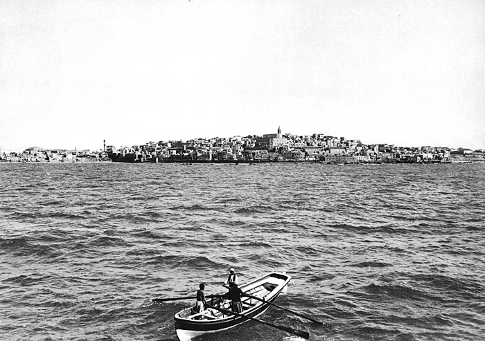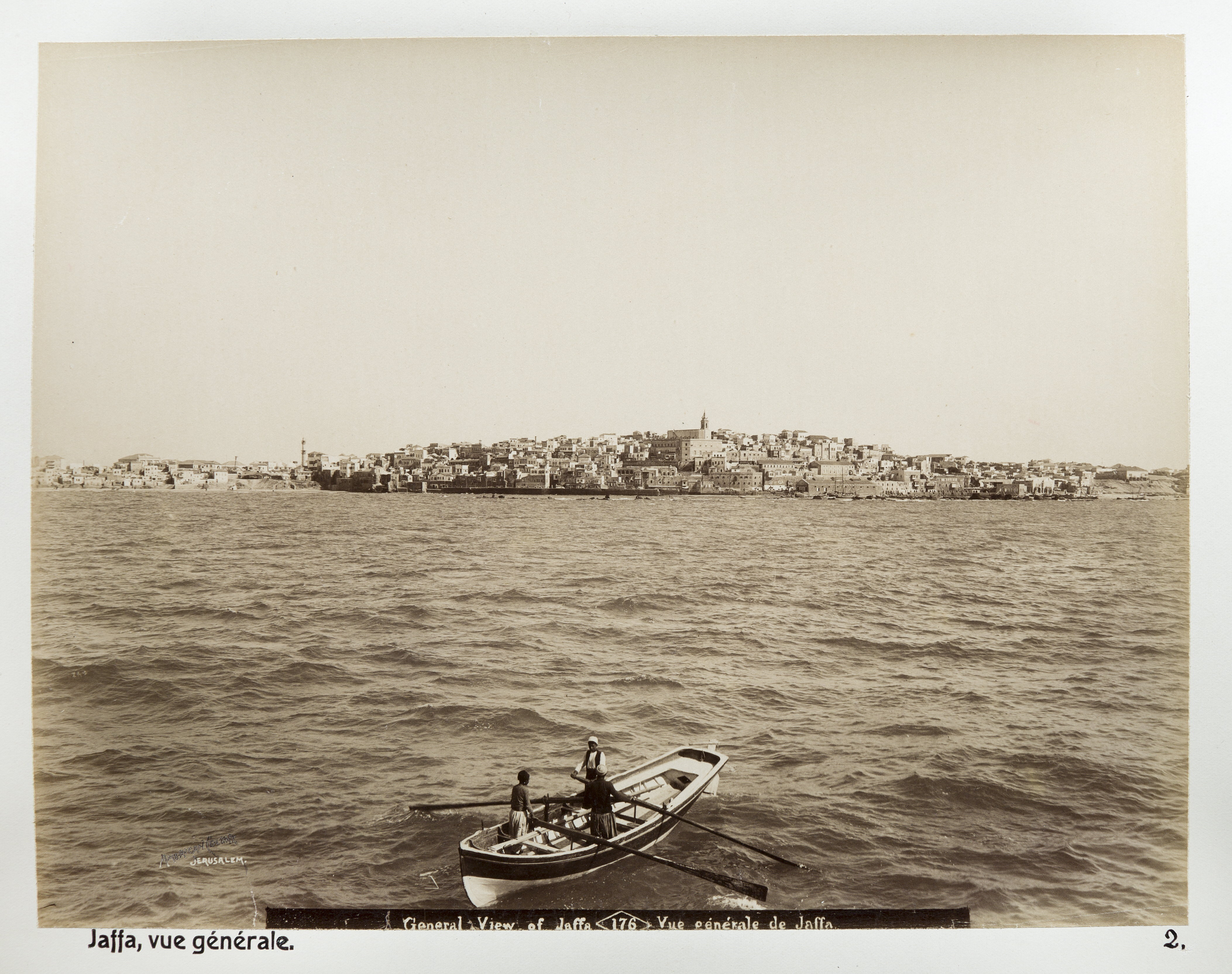 Vy över Jaffa, från havet. Text på originalet: "Jaffa, vue générale." Fotografierna LXVI:N.01.-180. kommer från resan till Palestina och Syrien som Wilhelmina och Walther von Hallwyl gjorde den 30 mars-27 april 1901. De lämnade Sverige den 5 november 1900 för Egypten, där de stannade till den 28 mars 1901, då de fortsatte till Palestina. Med på resan var Wilhelminas sällskapsdam, fröken Ida Uhse. Den 27 april fortsatte de till Turkiet och Mindre Asien. De mindre fotografierna (utom de från Samos) LXVI:N.90.-100. är tagna av Wilhelmina själv, under en resa till häst från Jerusalem till Damaskus 8-20 april 1901. Övriga fotografier är inköpta av Wilhelmina i Jerusalem, Damaskus och Beirut. Alla uppgifter kommer från Ida Uhses reseanteckningar.