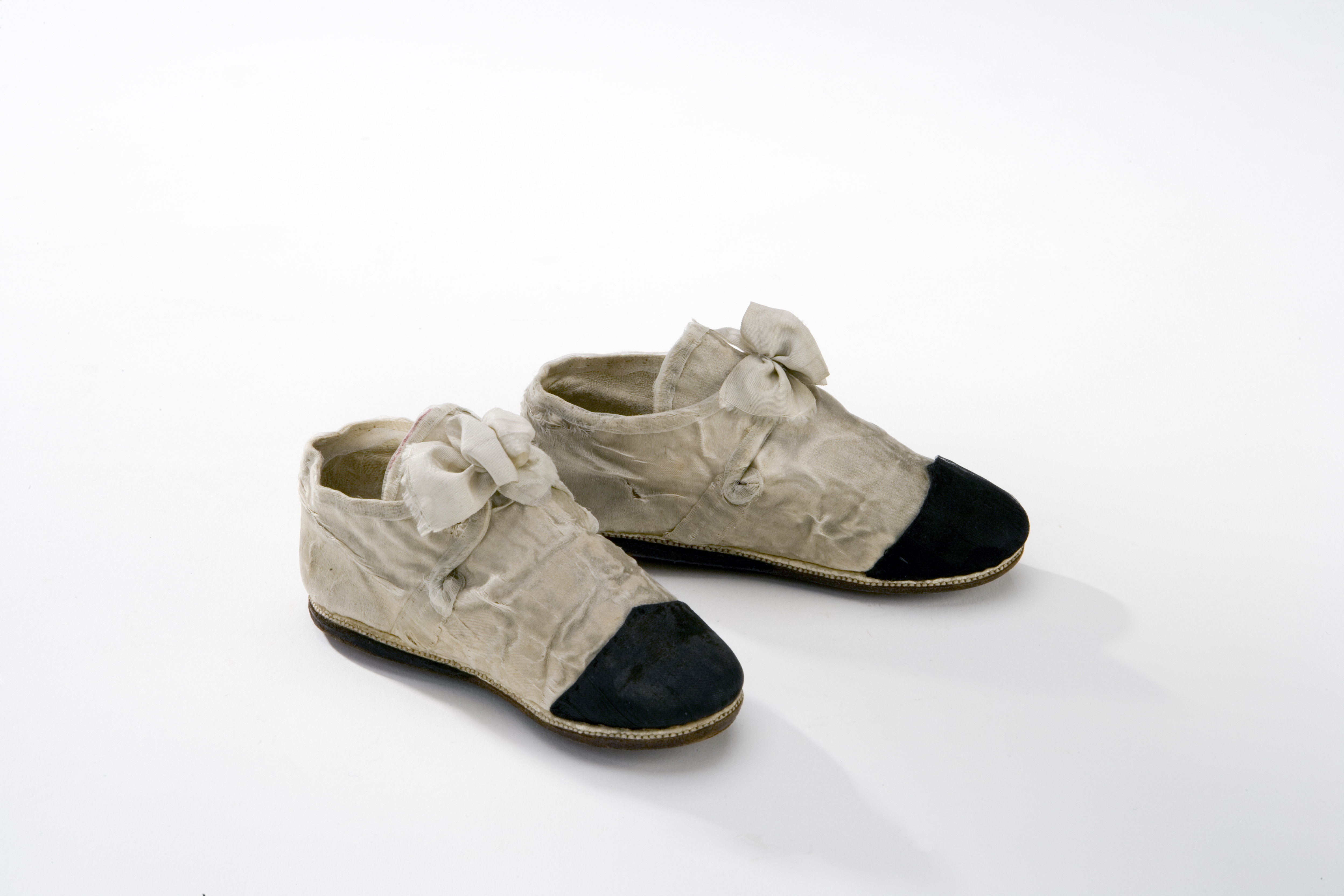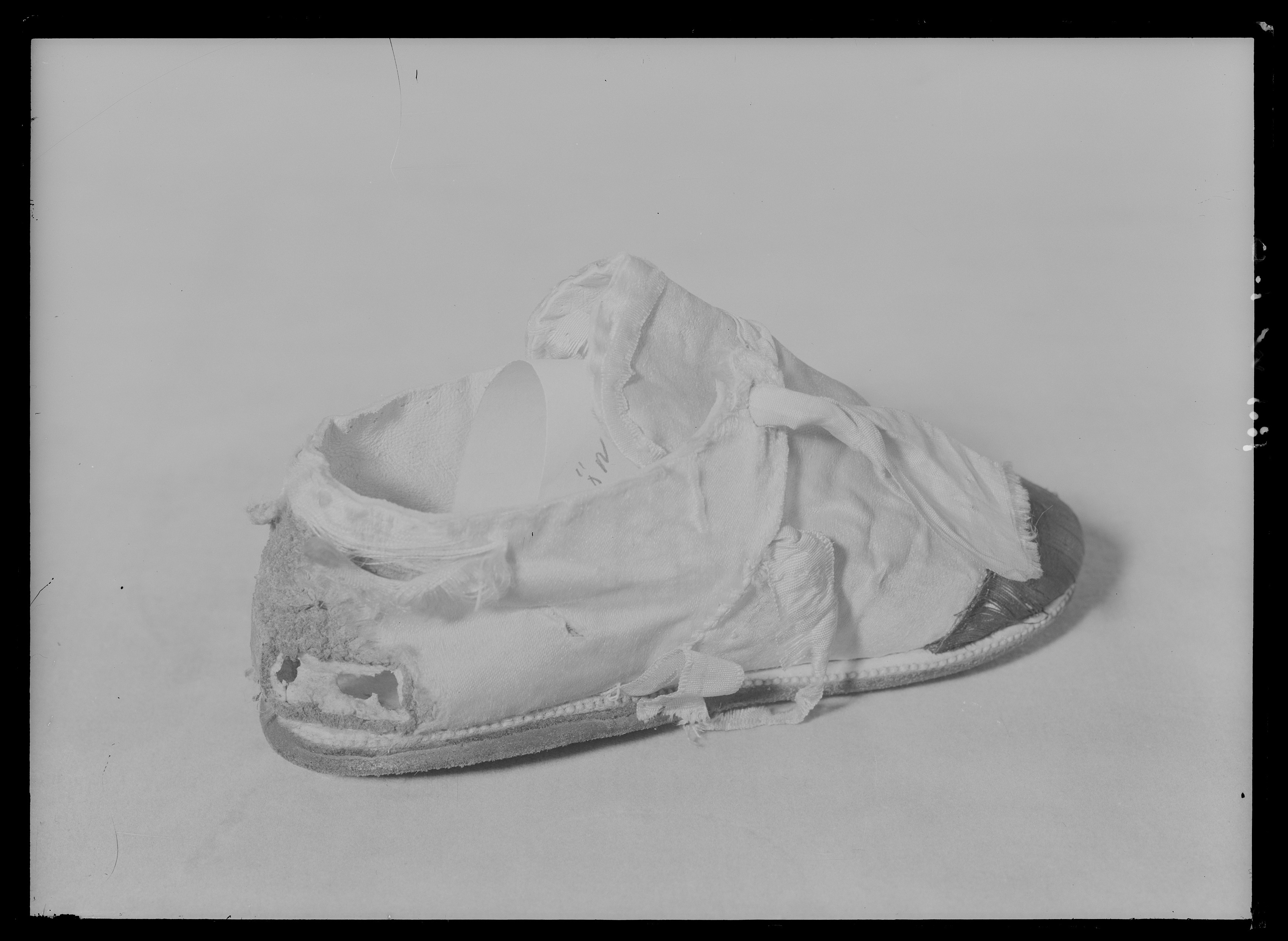 I vitt och svart siden. Sko i vitt siden sydd i ovanläder som går upp i en plös och en bakkappa med två slejfar. Ovanläder och bakkappa förenas genom sömmar på båda sidorna. De två slejfarna sluts med en i rosett knutet sidenband. Urringning, plös och slejfar är kantade med ett litet vitt sidenband. Skons läst är rak. Skon är dekorerad med svart siden på tåhättan. Fodret i bakkappan är av getskinn och ovanlädret är i linne. Sulan är av sämskläder och randsydd med klisterputsade sidor. Under randsyningen ligger en liten vit läderremsa som dekoration.