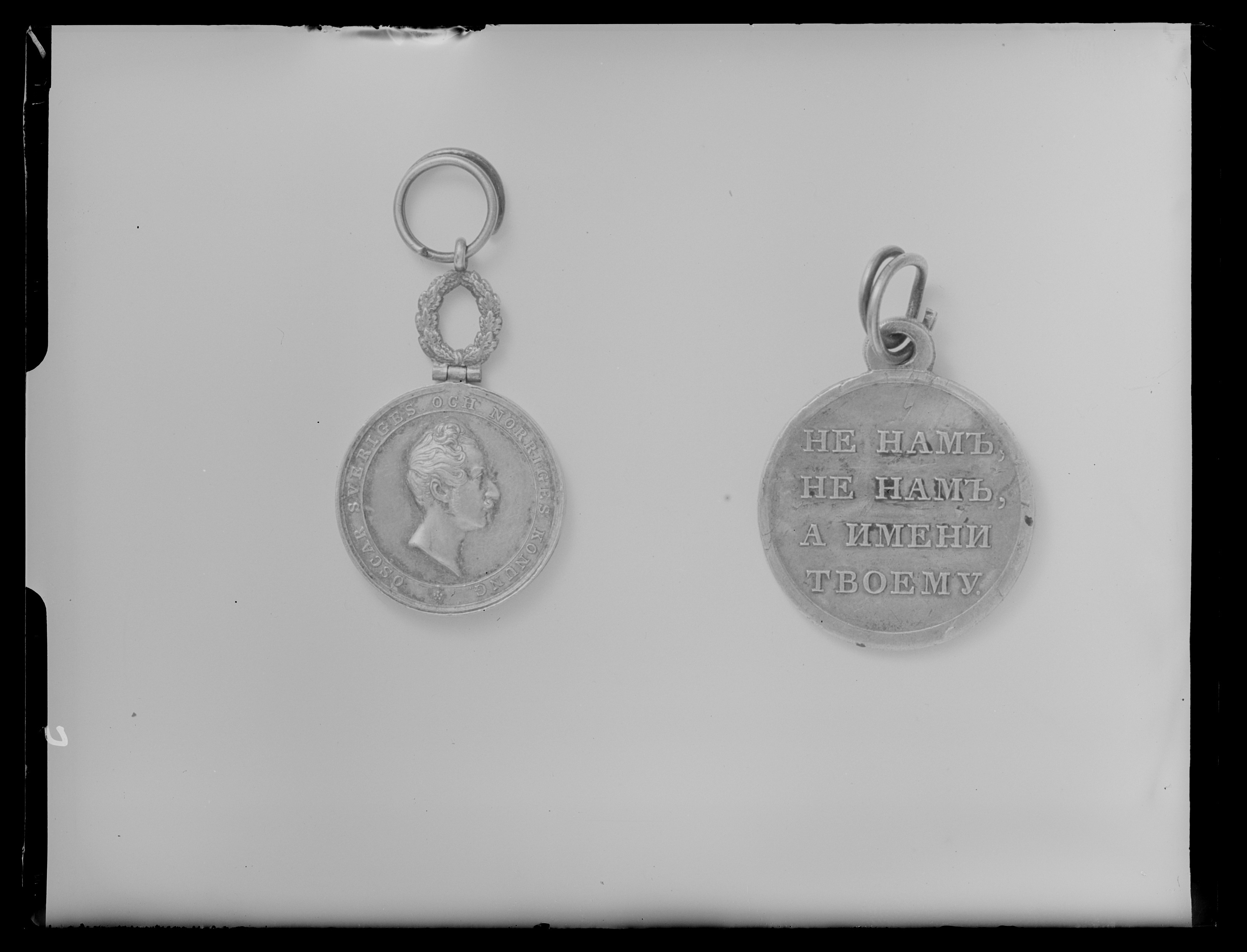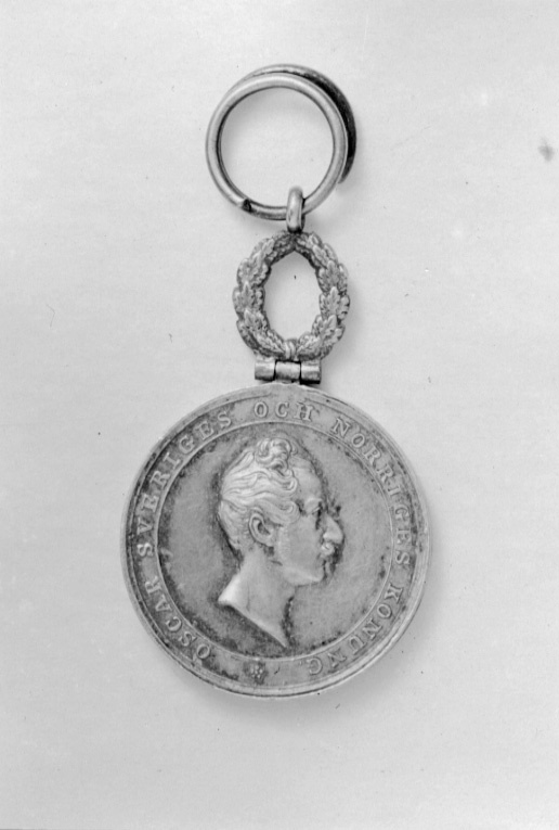 Åtsida: Oskar I, halsbild, profil h, omskrift: "OSCAR SVERIGES OCH NORRIGES KONUNG". Frånsida: präglad text: "TILL", "FÖR // LANDTMANNA // FÖRTJENST", graverad text: "Gen.Löjtn. // Commend. m.m. // Herr Grefve // Carl Gust. Löwenhjelm", omskrift: "GÖTEBORGS OCH BOHUSLÄNS K.GL HUSHÅLLNINGSSÄLLSKAP". Upptill fäst med scharner en oval eklövskrans, i övre delen en ring och däri fäst spiralformig ring.