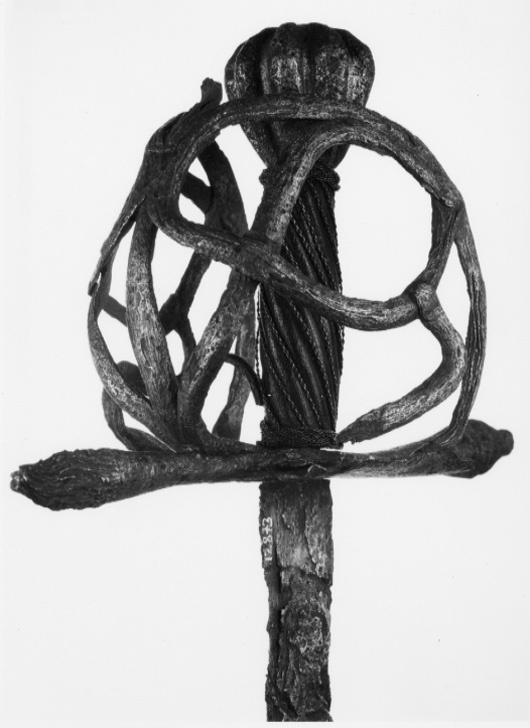 Korgfäste av (starkt rostskadat) stål, bildat av smidda, tämligen grova stålband, delvis korsande varandra. Knapp omvänt päronformig ornerad med djupa vertikala räfflor. Parerstänger raka, långa och platta med vidgade ytterdelar. Kavel spiralräfflad klädd med svart skinn i räfflorna dubbeltvinnade tunna, kedjeliknande silvertrådar. Kavelns klädsel ej ursprunglig. Klinga lång, svagt böjd, eneggad utom vid det tvåeggade spetspartiet. Spetsen bildad genom konkav inslipning från ryggsidan.