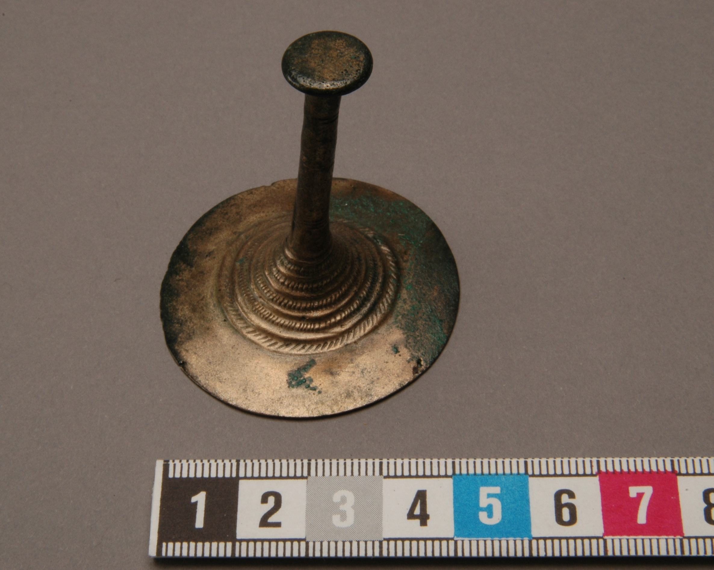 Tutulus av brons med flat, slät, 1.1 cm vid knopp på toppen. Tvärslån på baksidan är möjligen något nött.