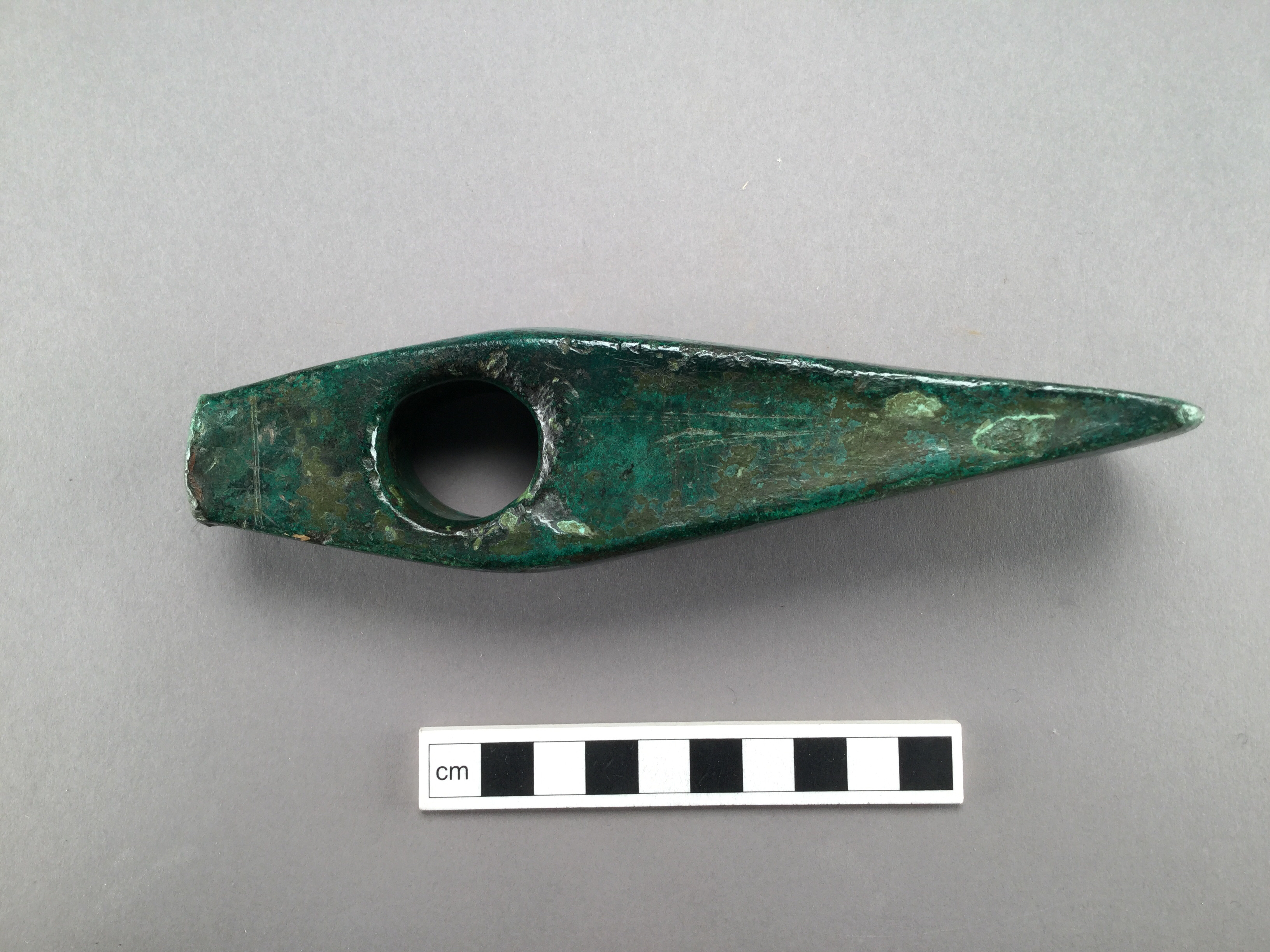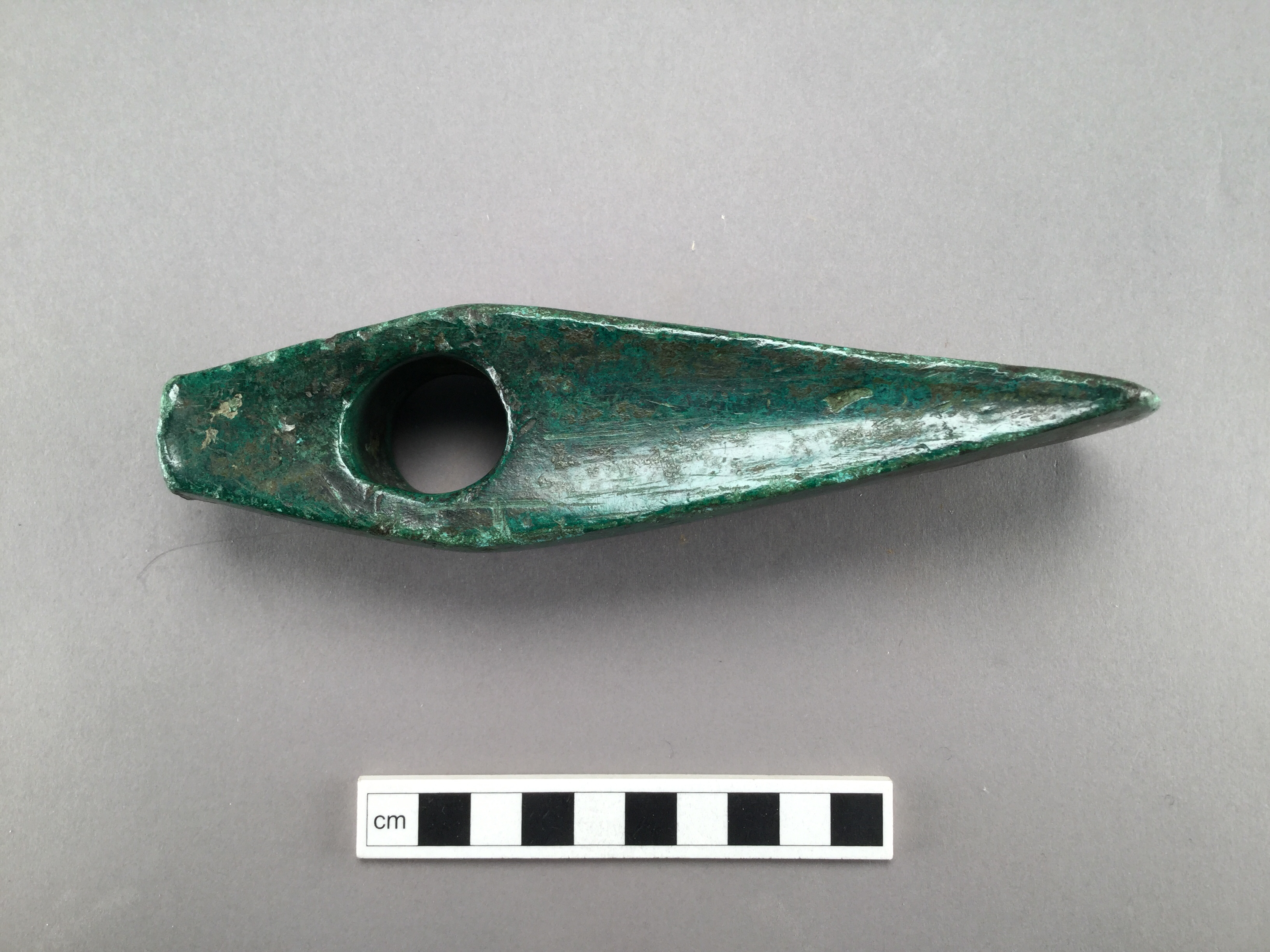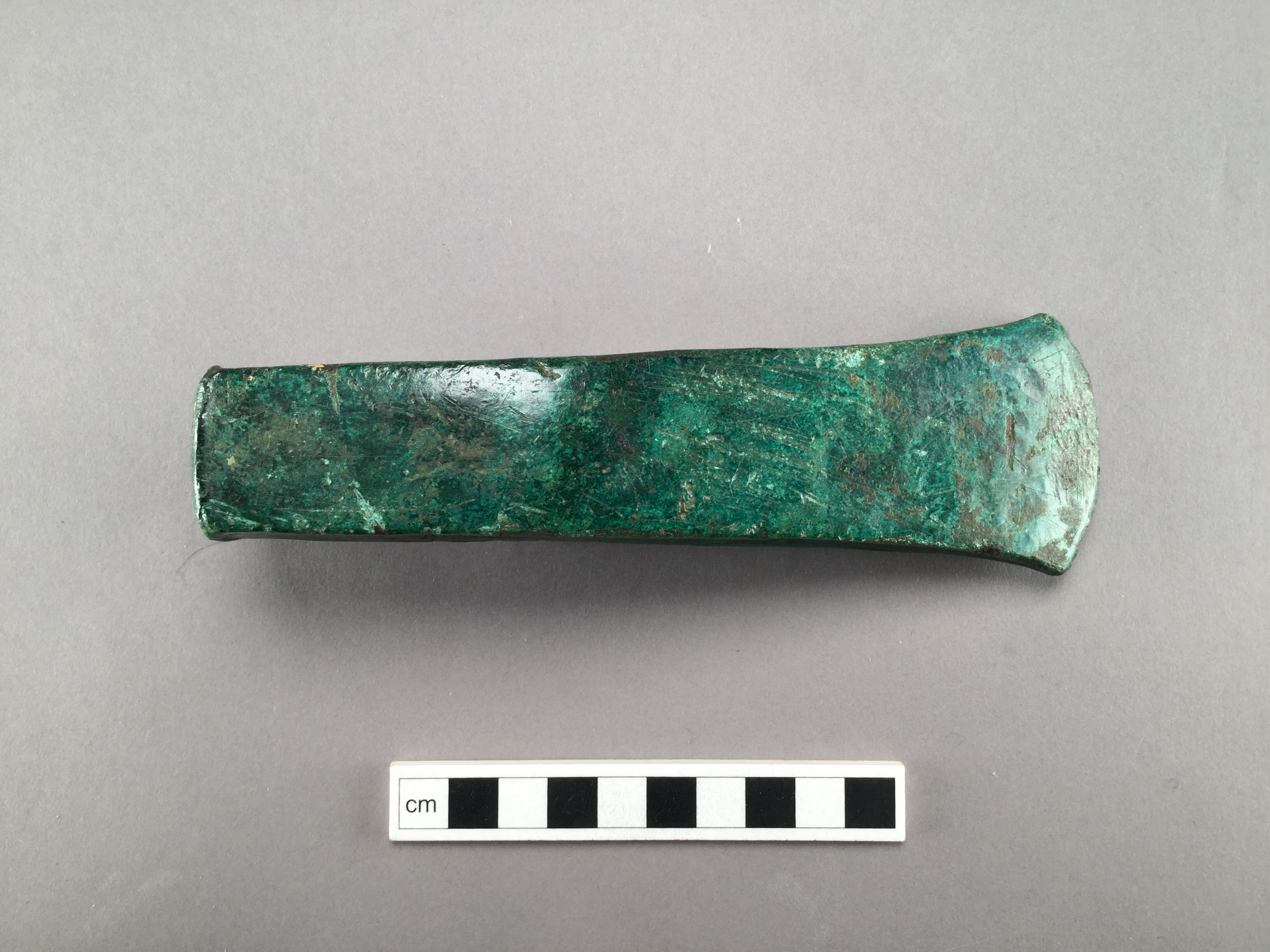 Skafthålsyxa av brons utan ornering. Eggen är trubbig och nacken något stukad.