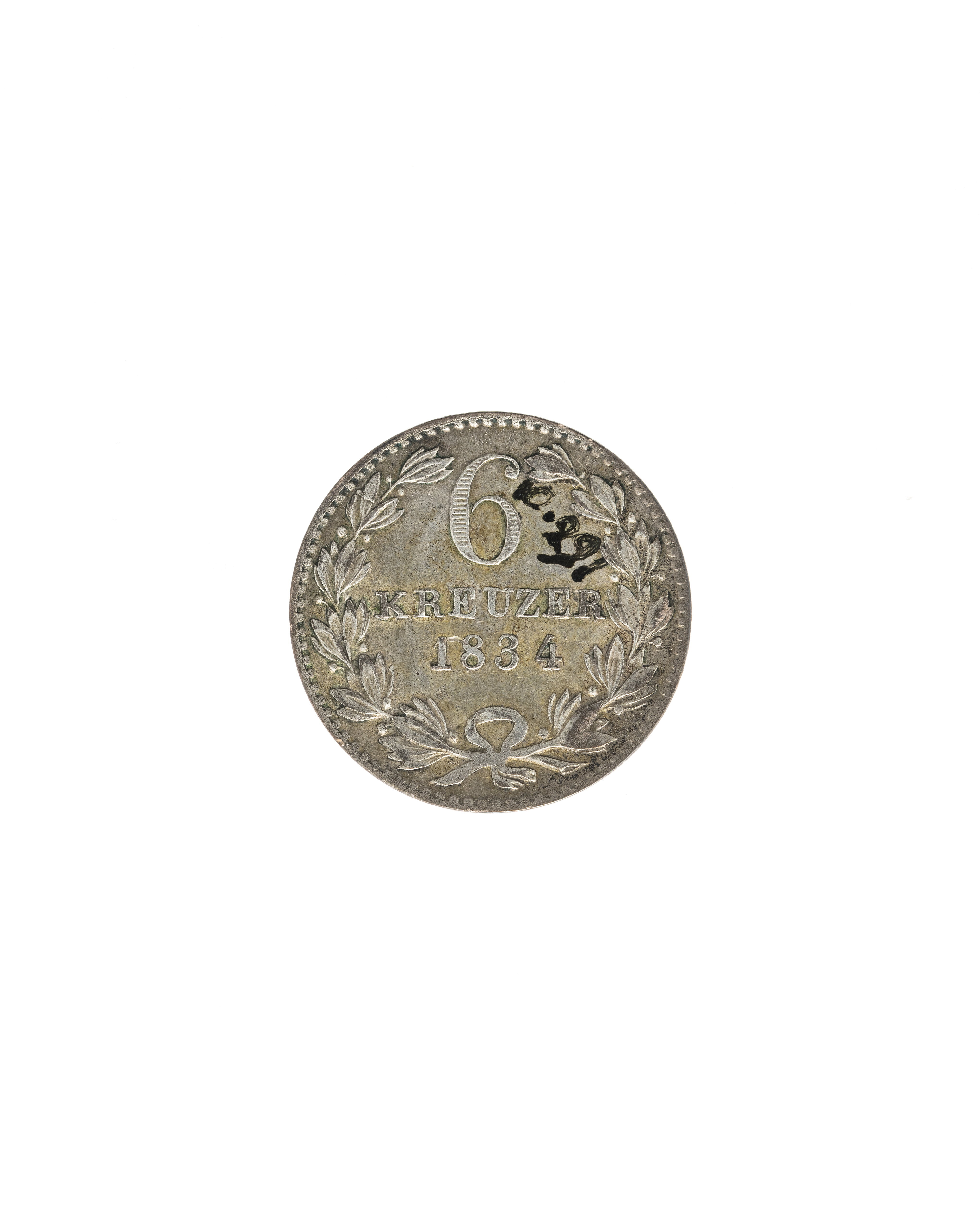 Åtsida: Lagerkrans, därinnanför: "6 // KREUZER // 1834". Frånsida: Porträtt av Leopold av Baden, halsbild, profil h., omskrift: "LEOPOLD GROSSHERZOG VON BADEN". Har tillhört Gustav IV Adolf under landsflykten. Gåva efter sonens (Gustav, prins av Vasa, 1799-1877) död av sondottern, drottning Karolina av Sachsen till kammarherre Adam Magnus Emanuel Lagergren (1844-1920). Enligt uppgift gåva av honom till LRK via Göteborgs museum (se brev 208:1907).