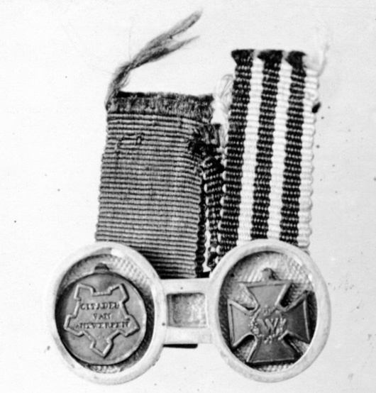 Glasögonformig platta av gulmetall med två ovala skivor, försänkt, punsad botten, blanka kanter. I vardera ovalen anbragt en medaljminiatyr av brons: 1 - till v. en rund medalj med fästningskontur, därinnanför stämplat: "CITADEL VAN ANTWERPEN" 2 - till h. miniatyr av nederländksa bronskorset. På baksidan bygel, därvid fäst två band, till v. mörkblå sidenmoaré, l: 54 mm, b: 11 mm. Till h. ripsband, randigt i blått och vitt, l: 50 mm, b: 10 mm. Båda bandens ändar fransiga, banden fastsydda vid varandra med svart silke.